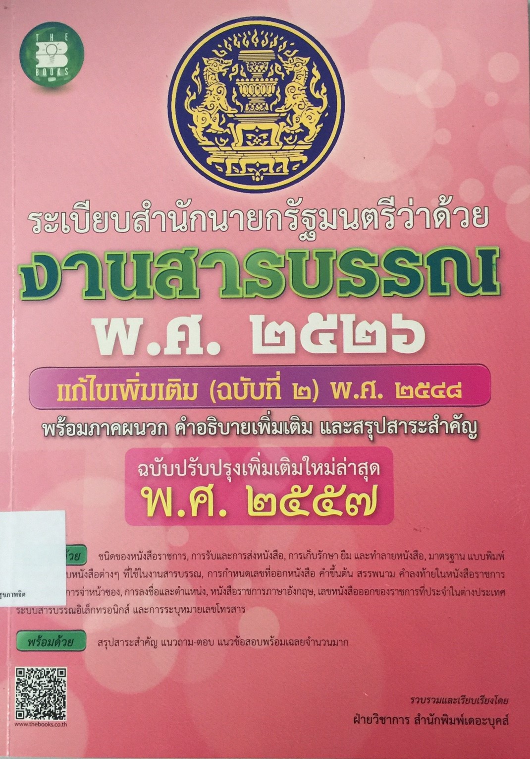 ระเบียบสำนักนายกรัฐมนตรี ว่าด้วยงานสารบรรณ พ.ศ. 2526 แก้ไขเพิ่มเติม(ฉบับที่ 2) พ.ศ. 2548 / รวบรวมและเรียบเรียงโดย ฝ่ายวิชาการสำนักพิมพ์เดอะบุคส์