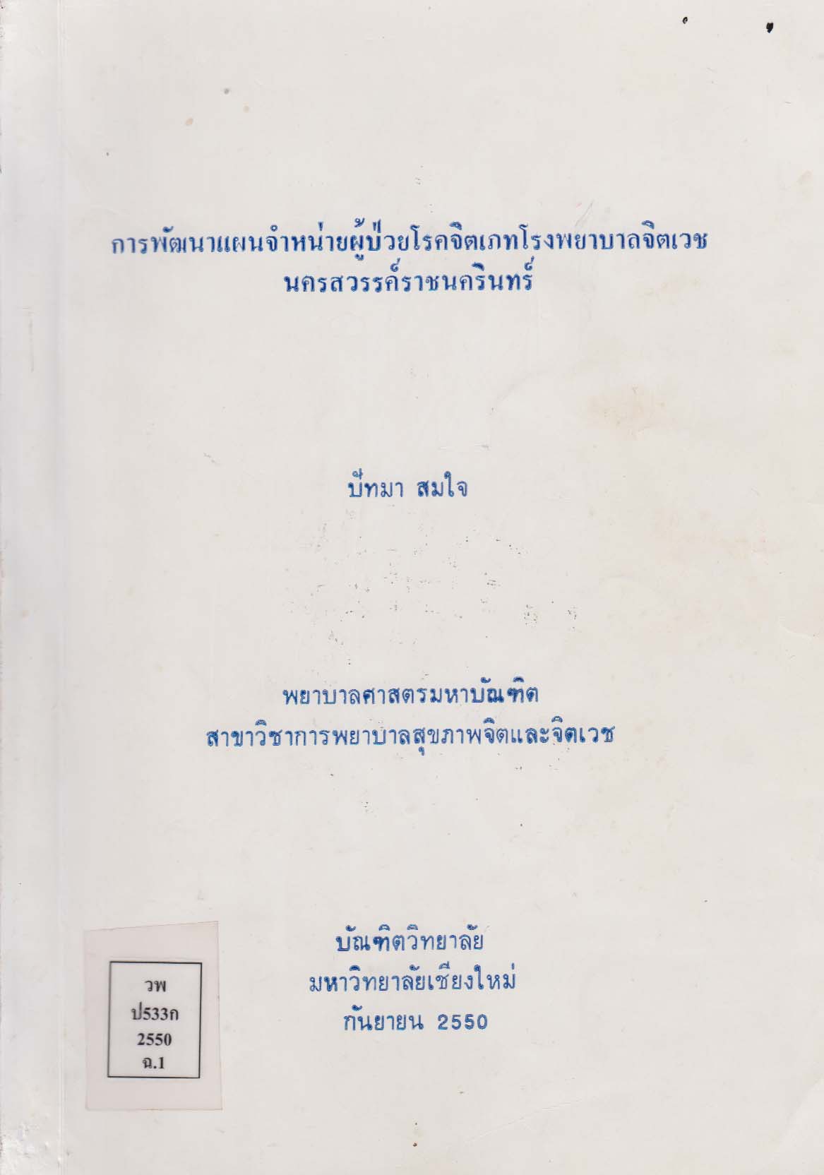Development of Discharge Planning for Patients with Schizophrenia,Nakhonsawan Rajanagarindra Psychiatric Hospital. |