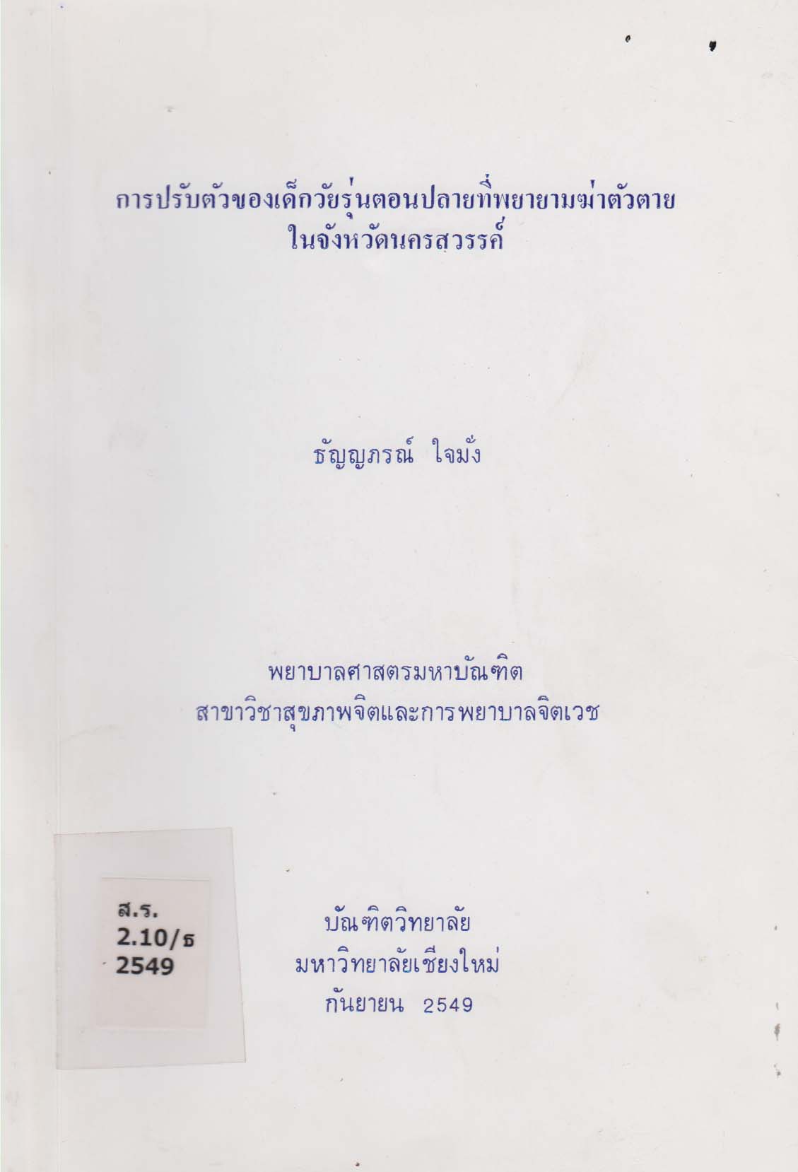 การปรับตัวของเด็กวัยรุ่นตอนปลายที่พยายามฆ่าตัวตายในจังหวัดนครสวรรค์ Adjustment of Suicidal Attempted Late Adolescents in Nakhon Sawan Province/ธัญญภรณ์ ใจมั่ง |