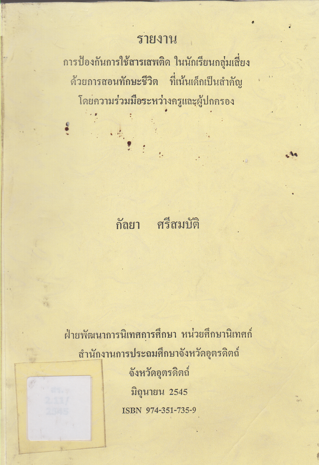 การป้องกันการใช้สารเสพติด ในนักเรียนกลุ่มเสี่ยงด้วยการสอนทักษะชีวิต ที่เน้นเด็กเป็นสำคัญโดยความร่วมมือระหว่างครูและผู้ปกครอง กัลยา ศรีสมบัติ