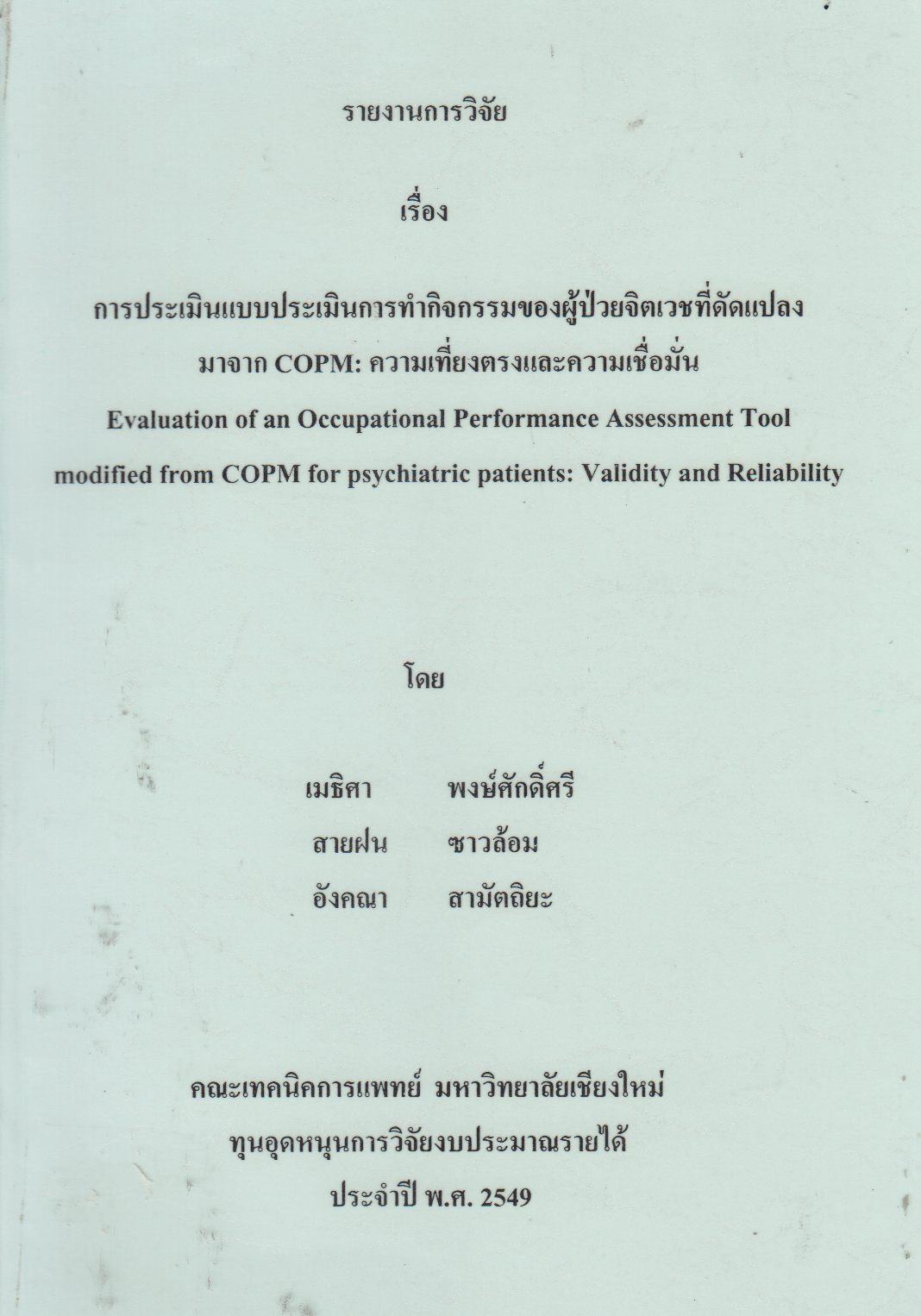 การประเมินแบบประเมินการทำกิจกรรมของผู้ป่วยจิตเวชที่ดัดแปลงมาจาก COPM: ความเที่ยงตรงและความเชื่อมั่น Evaluation of an occupational performance assessment tool modified from COPM for psychiatric patients: validity and reliability/ เมธิศา พงษ์ศักดิ์ศรี,สายฝน ซาวล้อม,อังคณา สามัตถิยะ