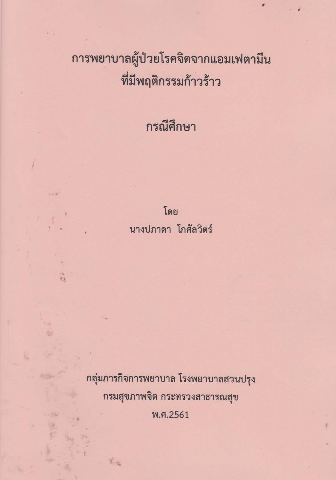 Contents: โรคจิตจากแอมเฟตามีน -- การรักษาโรคจิตจากแอมเฟตามีน -- แนวคิดการพยาบาลผู้ป่วยโรคจิตจากแอมเฟตามีน -- พฤติกรรมก้าวร้าว -- สาเหตุการเกิดพฤติกรรมก้าวร้าว -- การพยาบาลผู้ป่วยโรคจิตจากแอมเฟตามีนที่มีพฤติกรรมก้าวร้าว |