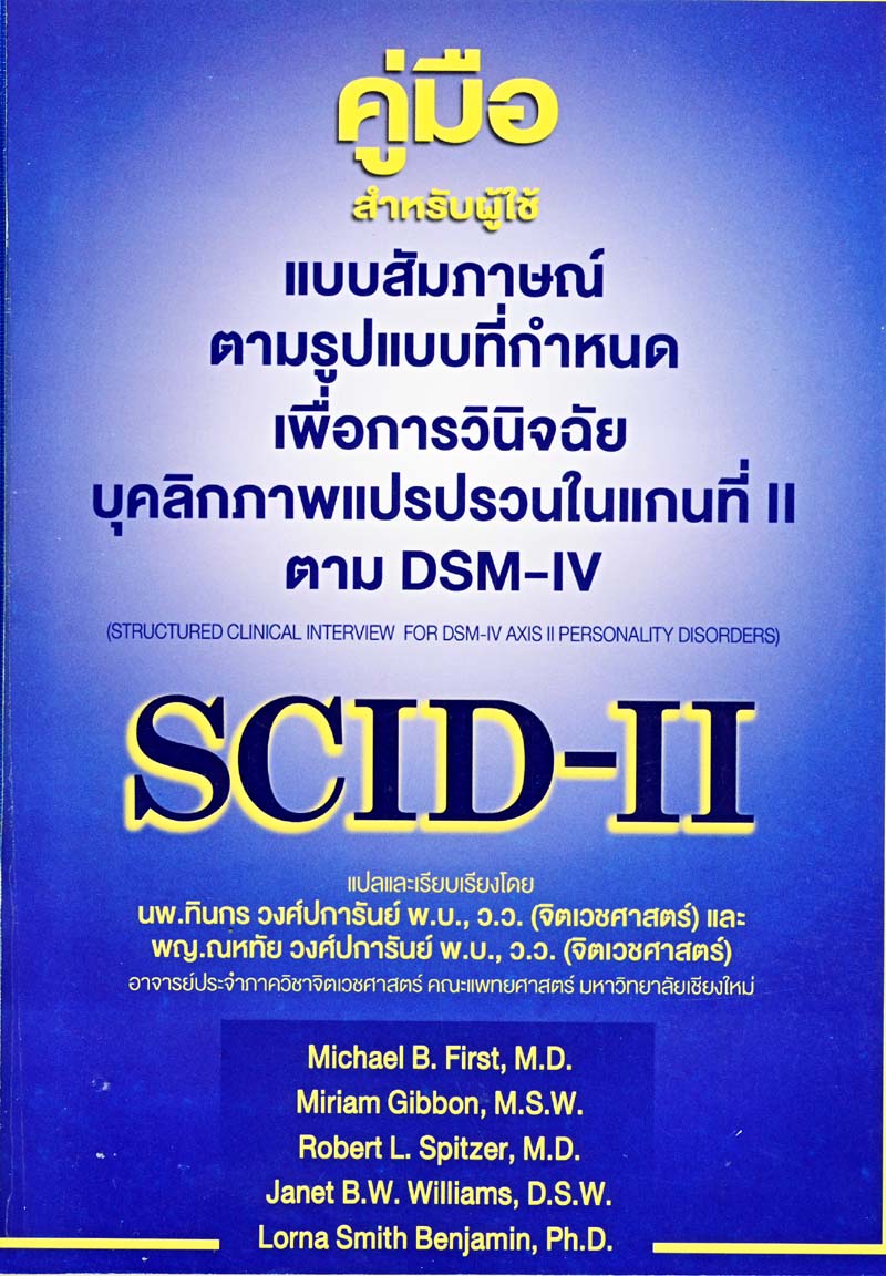 คู่มือสำหรับผู้ใช้แบบสัมภาษณ์ตามรูปแบบที่กำหนดเพื่อการวินิจฉัยบุคลิกภาพแปรปรวนในแกนที่ II ตาม DSM-IV SCID-II = Structured clinical interview for DSM-IV Axis II personality disorders / Michael B.First ... [et al.] ; แปลและเรียบเรียงโดย ทินกร วงศ์ปการันย์, ณหทัย วงศ์ปการันย์