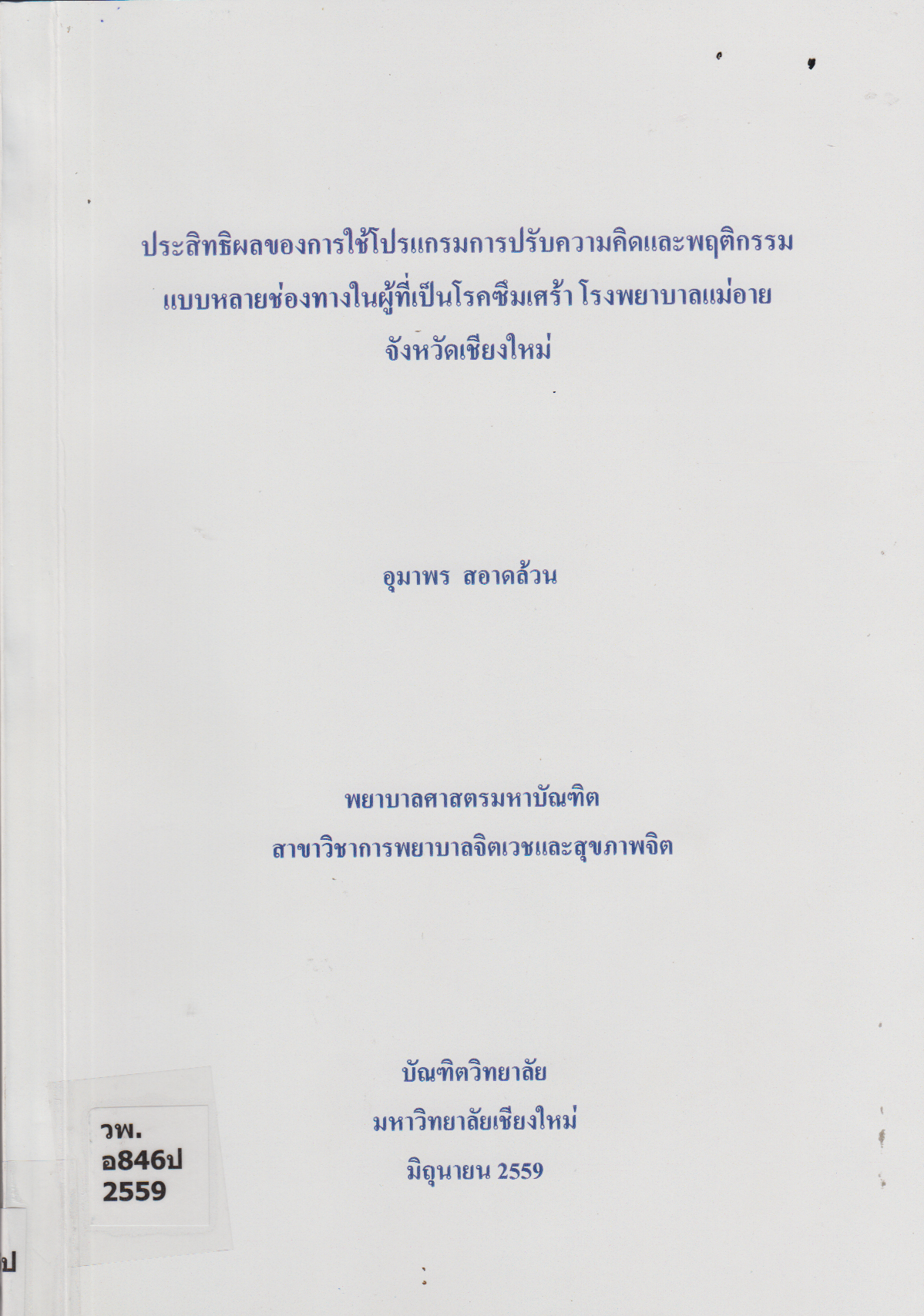 ประสิทธิผลของการใช้โปรแกรมการปรับความคิดและพฤติกรรมแบบหลายช่องทางในผู้ที่เป็นโรคซึมเศร้า โรงพยาบาลแม่อาย จังหวัดเชียงใหม่= Effectiveness of Implementing the Cognitive Behavior Therapy Multi-Channel Program Among Persons with Major Depressive Disorder, Maeai Hospital, Chiang Mai Province/ อุมาพร สอาดล้วน