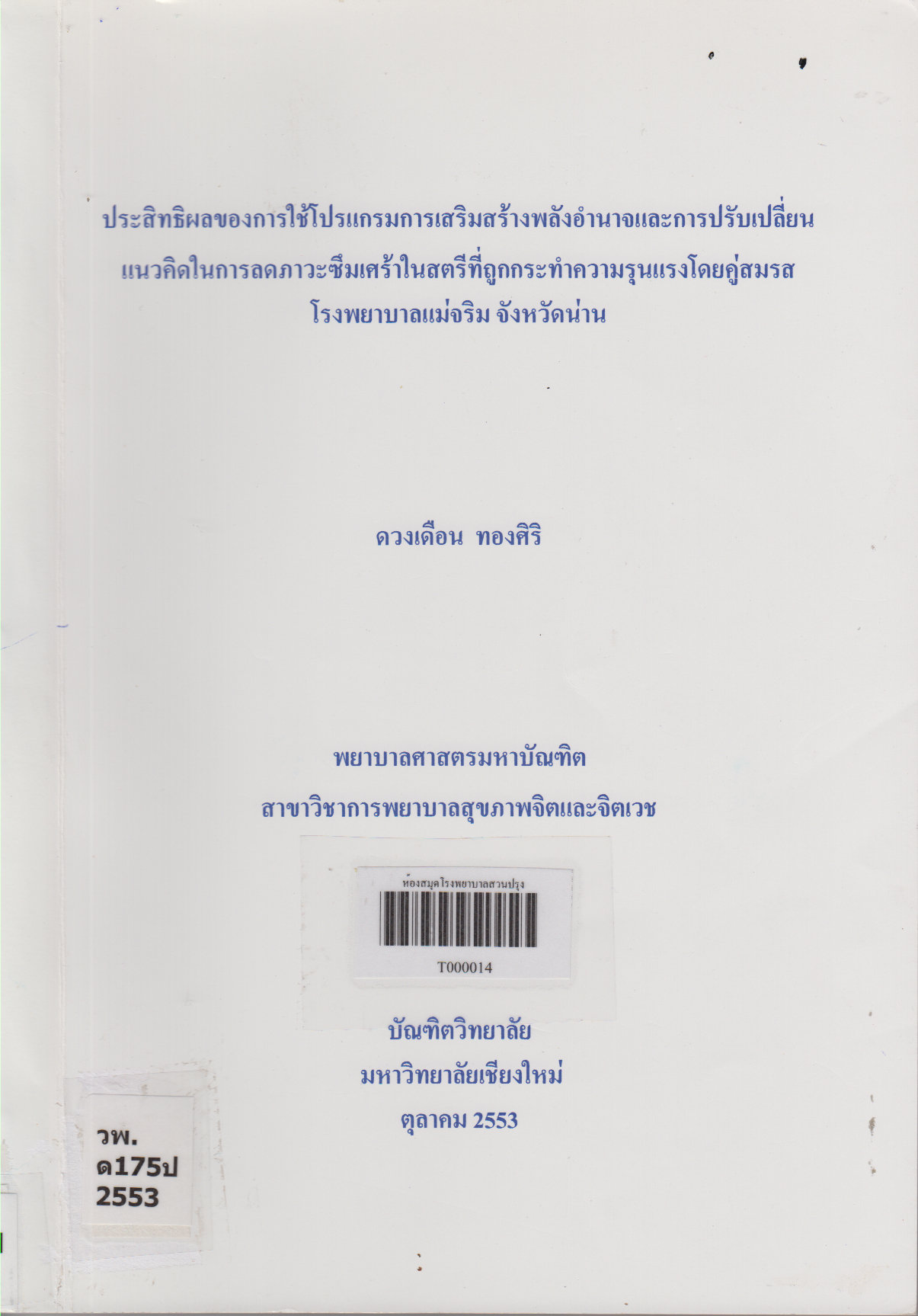 ประสิทธิผลของการใช้โปรแกรมการเสริมสร้างพลังอำนาจและการปรับเปลี่ยนแนวคิดในการลดภาวะซึมเศร้าในสตรีที่ถูกกระทำความรุนแรงโดยคู่สมรส โรงพยาบาลแม่จริม จังหวัดน่าน = Effectiveness of Implementing Empowerment and Cognitive Restructuring Program on Depression Reduction Among Women Experiencing Spousal Abuse, Mae Cha Rim Hospital, Nan Province/ดวงเดือน ทองศิริ |