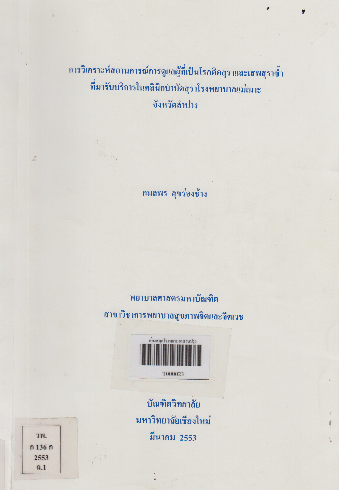 การวิเคราะห์สถานการการดูแลผู้ที่เป็นโรคติดสุราและเสพสุราซ้ำที่มารับบริการในคลินิกบำบัดสุราโรงพยาบาลแม่เมาะ จังหวัดลำปาง Situational Analysis of Caring for Patients with Alcohol Dependence and Repeated Drinking Receiving Services at Cessation Clinic, Maemoh Hospital, Lampang Province/ กมลพร สุขร่องช้าง |