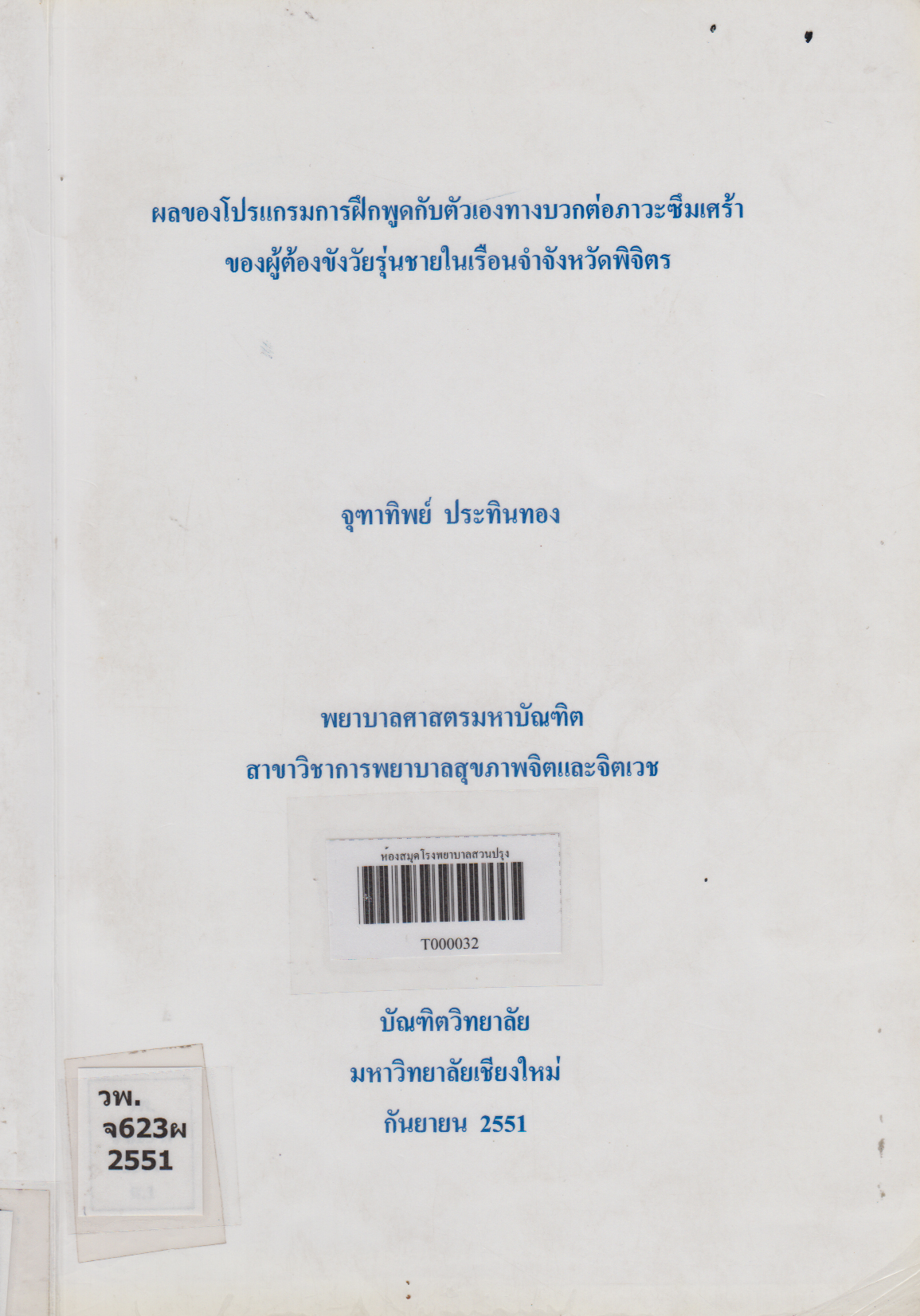 ผลของโปรแกรมการฝึกพูดกับตัวเองทางบวกต่อภาวะซึมเศร้าของผู้ต้องขังวัยรุ่นชายในเรือนจำจังหวัดพิจิตร Effect of Positive Self-talk Training Program on Depression Among Incarcerated Male Adolescent in Phichit Prison/จุฑาทิพย์ ประทินทอง |