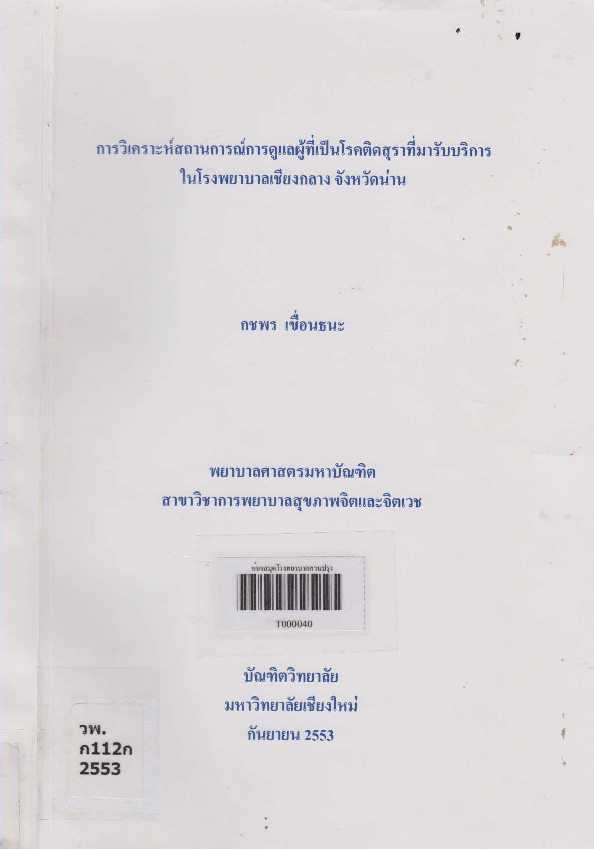 การวิเคราะห์สถานการณ์การดูแลผู้ที่เป็นโรคติดสุราที่มารับบริการในโรงพยาบาลเชียงกลาง จังหวัดน่าน Situational Analysis of Caring for Persons with Alcohol Dependence Receiving Services at Chiangklang Hospital, Nan Province/กชพร เขื่อนธนะ |