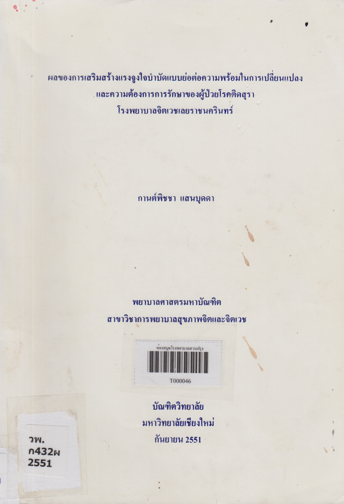 ชื่อเรื่องที่แตกต่าง  Effects of Brief Motivational Enhancement Therapy on Change Readiness and Treatment EagernessAmong patients with alcohol Dependence, Loei Rajanagarindra Psychiatric Hospital