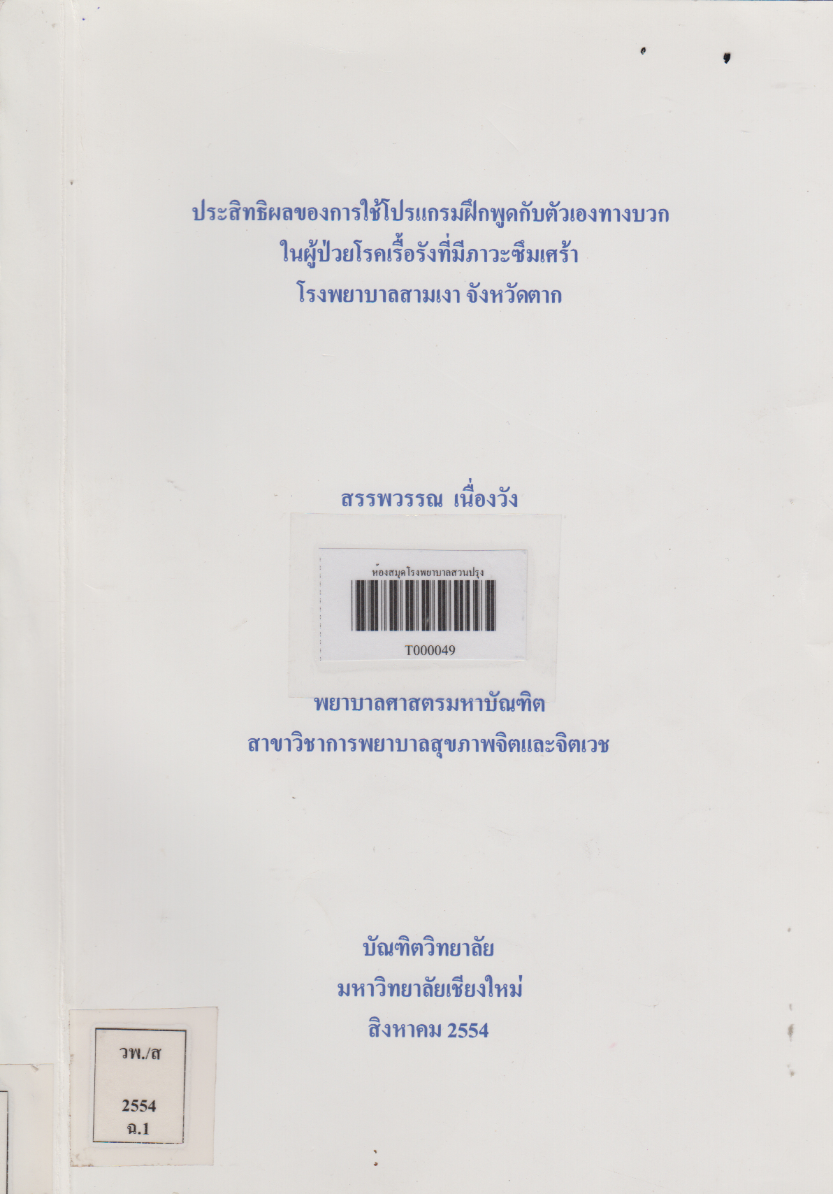ประสิทธิผลของการใช้โปรแกรมฝึกพูดกับตัวเองทางบวกในผู้ป่วยโรคเรื้อรังที่มีภาวะซึมเศร้า โรงพยาบาลสามเงา จังหวัดตาก Effectiveness of Implementing a Positive Self-talk Training Program Among Chronically ill Patients with Depression,Samngao Hospital, Tak Province /สรรพวรรณ เนื่องวัง |
