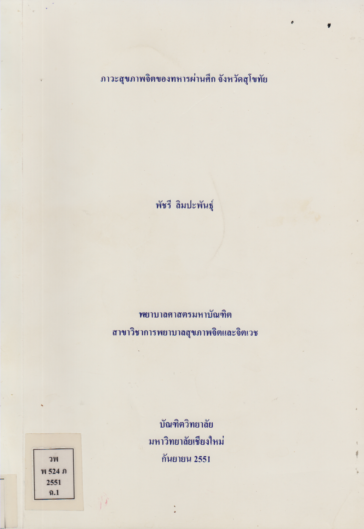 ภาวะสุขภาพจิตของทหารผ่านศึก จังหวัดสุโขทัย Mental Health Status Among Velerans, Sukhothai Province /พัชรี ลิมปะพันธ์ |