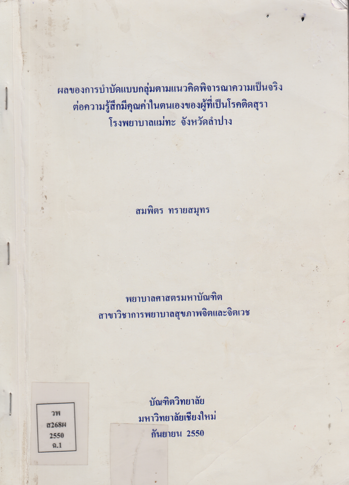 ผลของการบำบัดแบบกลุ่มตามแนวคิดพิจารณาความเป็นจริงต่อความรู้สึกมีคุณค่าในตนเองของผู้ที่เป็นโรคติดสุรา โรงพยาบาลแม่ทะ จังหวัดลำปาง Effect of the Group Reality Therapy on Self-esteem Among Persons with Alcohol Dependence, Maetha Hospital,Lampang Province /สมพิตร ทรายสมุทร |