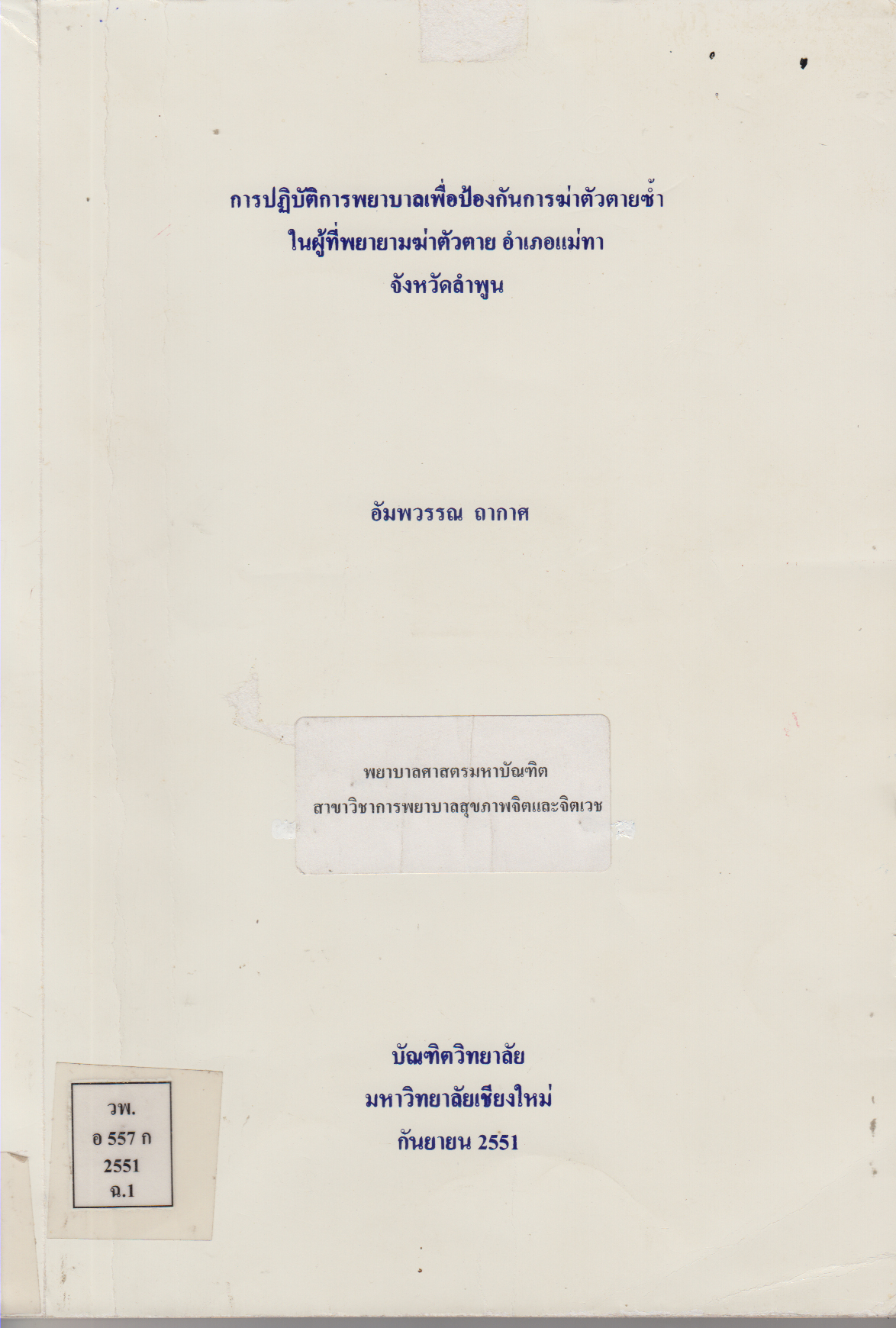การปฏิบัติการพยาบาลเพื่อป้องกันการฆ่าตัวตายซ้ำในผู้ที่พยายามฆ่าตัวตาย อำเภอแม่ทา จังหวัดลำปาง Nursing Practices for Repeat Suicidal Prevention Among Persons with Attempted Suicide,Mae Tha District, Lamphun Province /อัมพวรรณ ถากาศ |
