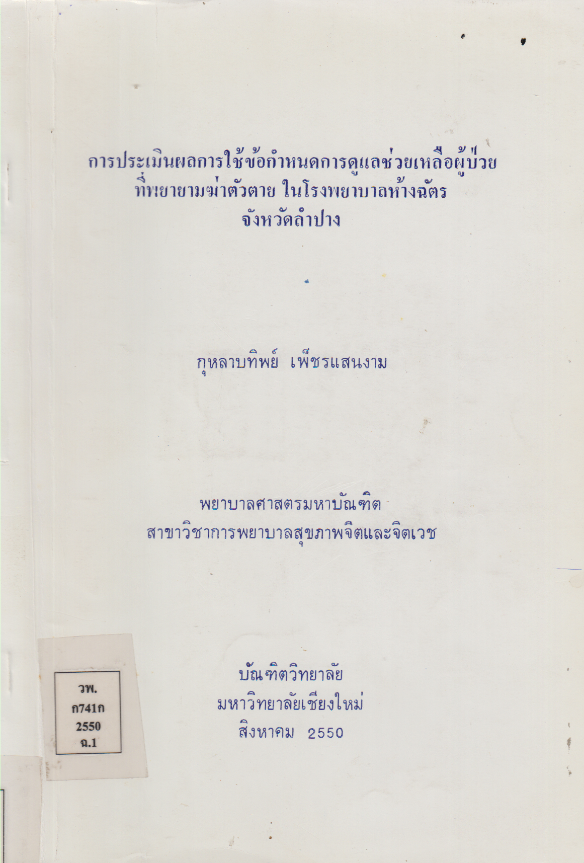 การประเมินผลการใช้ข้อกำหนดการดูแลช่วยเหลือผู้ป่วยที่พยายามฆ่าตัวตาย ในโรงพยาบาลห้างฉัตร จังหวัดลำปาง Evaluation of Implementing Suicide Care for Suicidal Attempted Patients Protocol in Hangchat Hospital, Lampang Province/กุหลาบทิพย์ เพ็ชรแสนงาม |