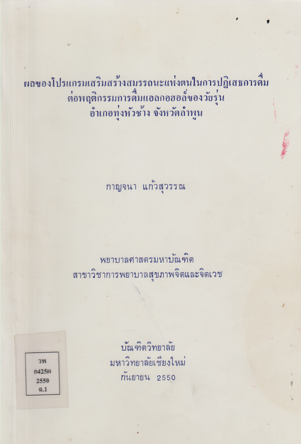 ผลของโปรแกรมเสริมสร้างสมรรถนะแห่งตนในการปฏิเสธการดื่มแอลกอฮอล์ของวัยรุ่น อำเภอทุ่งหัวช้าง จังหวัดลำพูน Effect of Self-efficacy Enhancement for Drinking Refusal Program on Alcohol Drinking Behaviors Among Aldolescents at Thunghuachang District, Lamphun Province/กาญจนา แก้วสุวรรณ |