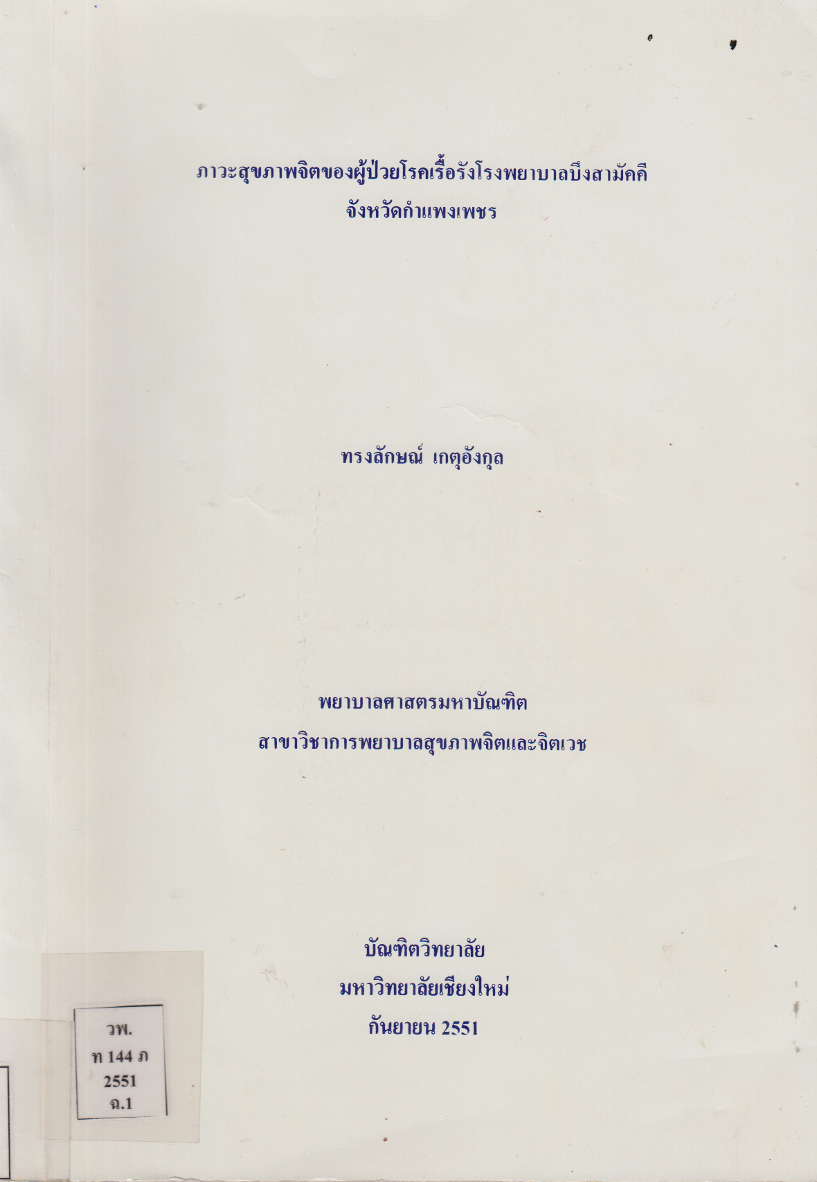 ภาวะสุขภาพจิตของผู้ป่วยโรคเรื้อรังโรงพยาบาลบึงสามัคคี จังหวัดกำแพงเพชร Mental Health Status of Chronically III Patients, Bueng Samakkhi Hospital, Kamphaeng Phet Province/ทรงลักษณ์ เกตุอังกุล |