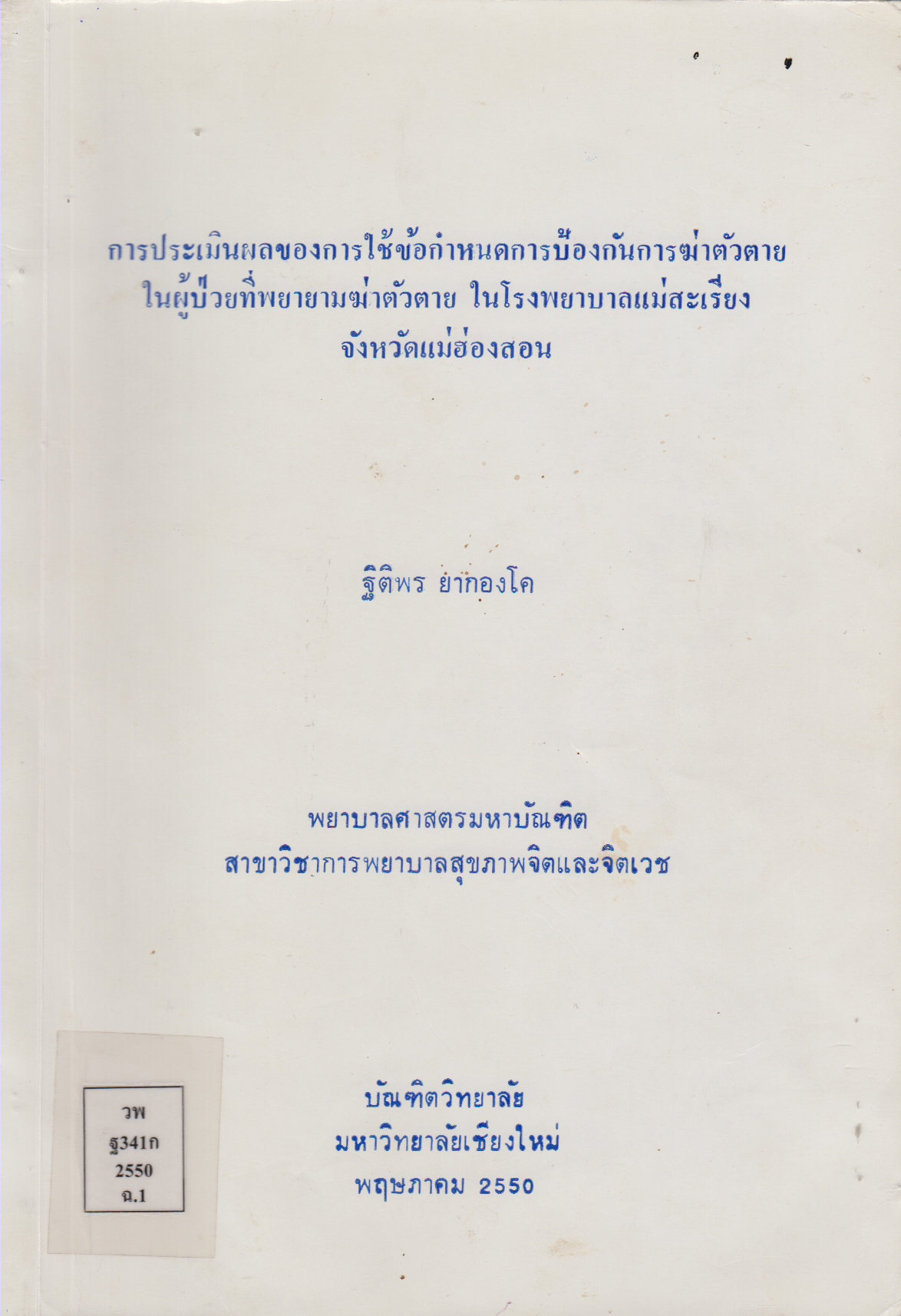 การประเมินผลของการใช้ข้อกำหนดการป้องกันการฆ่าตัวตายในผู้ป่วยที่พยายามฆ่าตัวตาย ในโรงพยาบาลแม่สะเรียง จังหวัดแม่ฮ่องสอน Evaluation of Implementing Suicide Precaution for Suicidal Affempted Patients Protocol in Maesariang Hospital, Mae Hong Son Province/ฐิติพร ยากองโค |