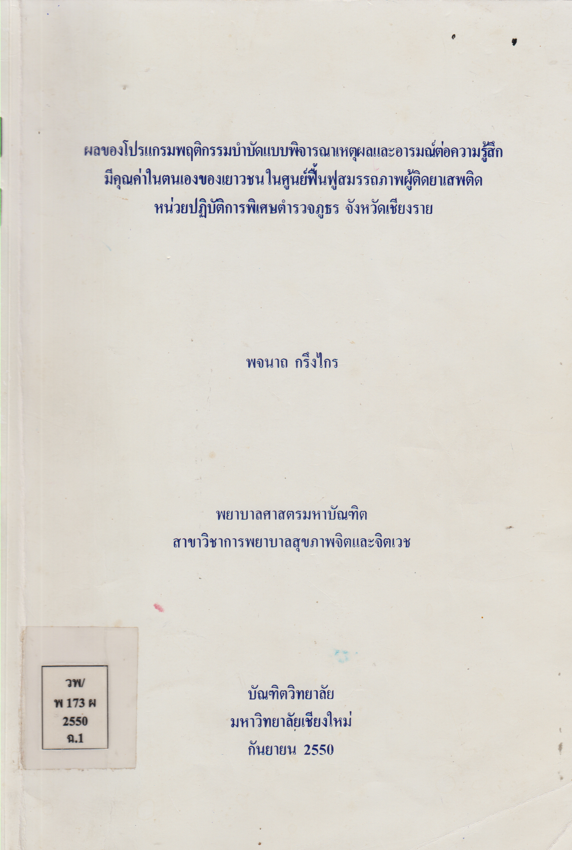 ผลของโปรแกรมพฤติกรรมบำบัดแบบพิจารณาเหตุผลและอารมณ์ต่อความรู้สึกมีคุณค่าในตนเองของเยาวชนในศูนย์ฟื้นฟูสมรรถภาพผู้ติดยาเสพติด หน่วยปฏิบัติการพิเศษตำรวจภูธร จังหวัดเชียงราย Effect of Rational Emotive Behavior Therapy Program on Self-esteem of Adolescents in Drug Addicts Rehabilitation Center Chiang Rai Police Action Force/พจนาถ กรึงไกร |
