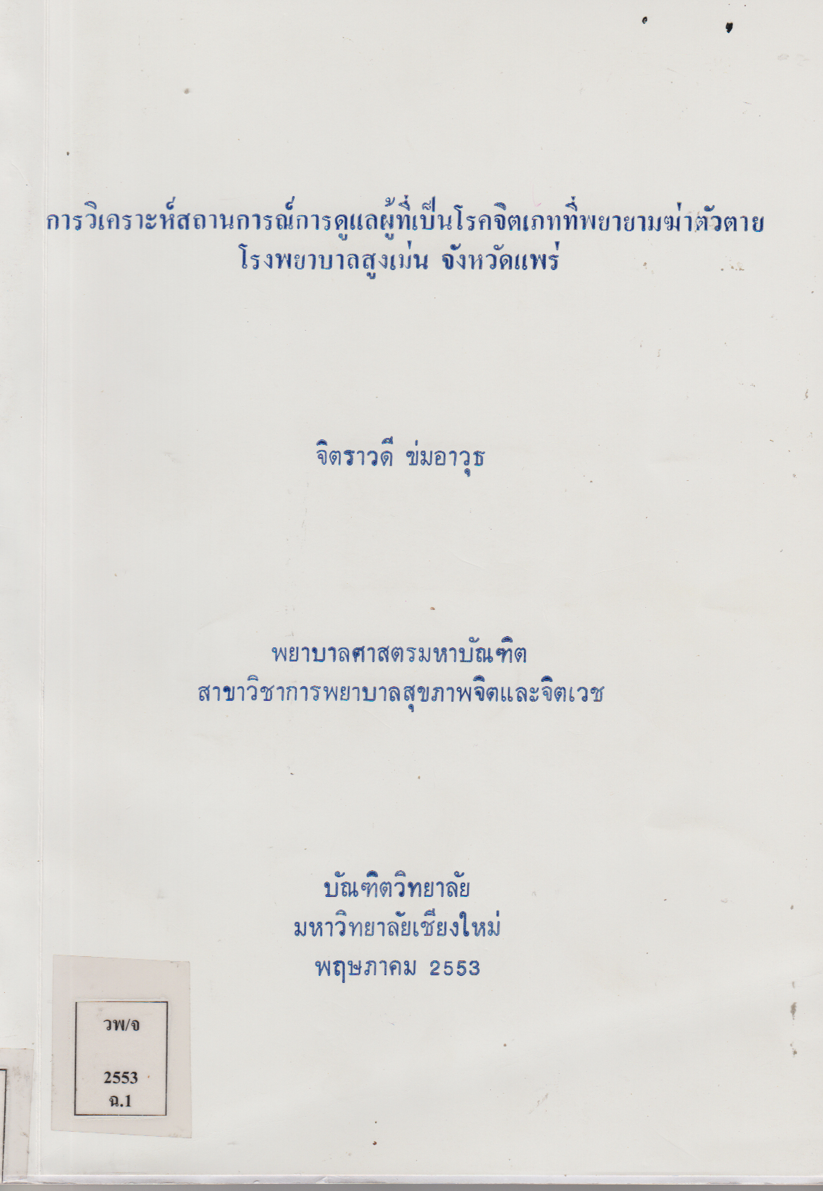 การวิเคราะห์สถานการณ์การดูแลผู้ที่เป็นโรคจิตเภทที่พยายามฆ่าตัวตาย โรงพยาบาลสูงเม่น จังหวัดแพร่ Situational Analysis of Caring for Persons with Schizophrenia who Attempted Suicide at sungmen Hospital,Phrae Province /จิตราวดี ข่มอาวุธ |