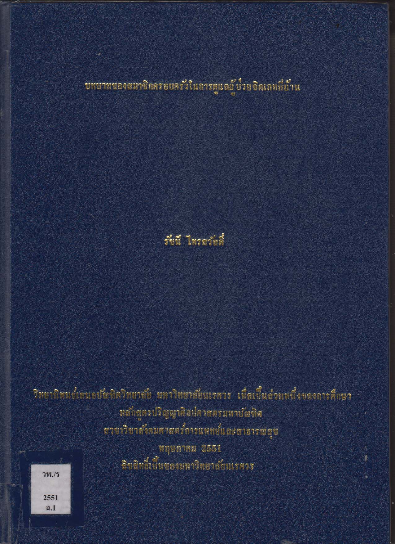 บทบาทของสมาชิกครอบครัวในการดุแลผู้ป่วยจิตเภทที่บ้าน Family Member Role for Home Care of Schizophrenia Patients/วุฒิพงศ์ ถายะพิงค์ |
