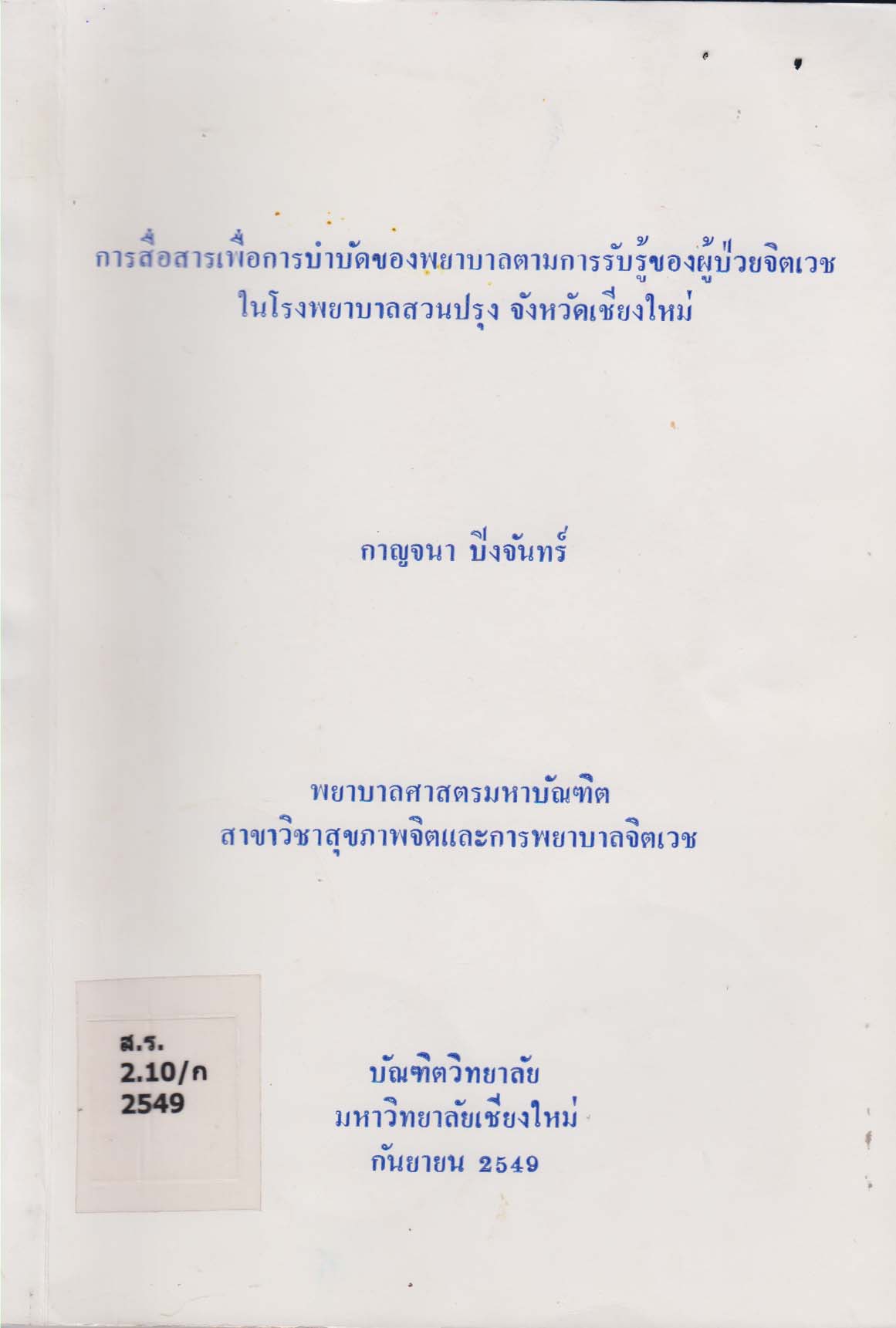 การสื่อสารเพื่อการบำบัดของพยาบาลตามการรับรู้ของผู้ป่วยจิตเวชในโรงพยาบาลสวนปรุง จังหวัดเชียงใหม่ Nurse's Therapeutic Communication as Perceived by Psychiatric Patients in Suan Prung Psychiatric Hospital, Chiang Mai Province/กาญจนา ปิงจันทร์ |