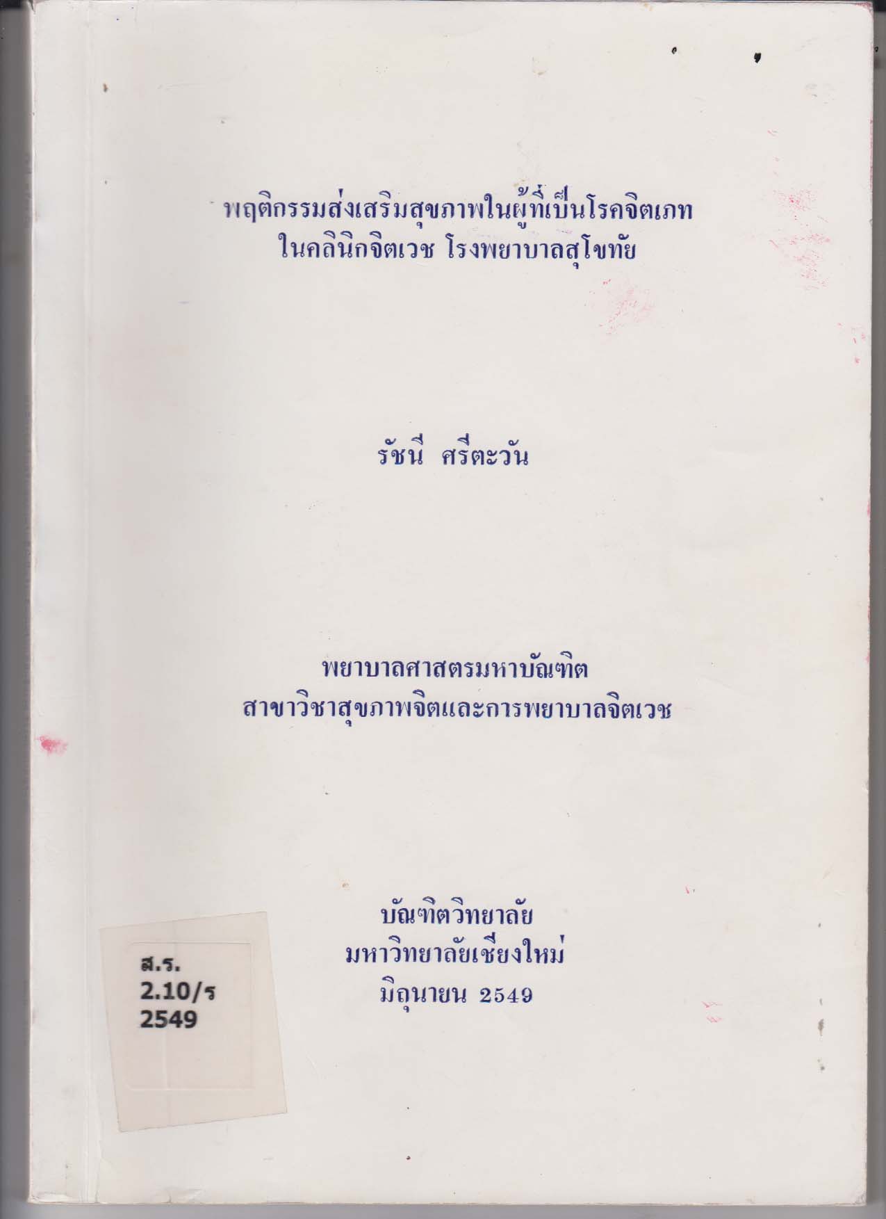 พฤติกรรมส่งเสริมสุขภาพในผู้ที่เป็นโรคจิตเภทในคลินิกจิตเวช โรงพยาบาลสุโขทัย Health Promoting Behaviors Among Persons with Schizophrenia at the Psychiatric Clinic,Sukhothai Hospital/รัชนี ศรีตะวัน |