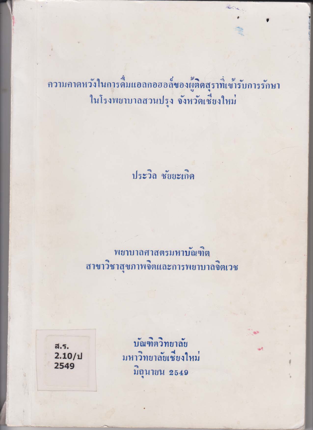 ความคาดหวังในการดื่มแอลกอฮอล์ของผู้ติดสุราที่เข้ารับการรักษาในโรงพยาบาลสวนปรุง จังหวัดเชียงใหม่ /Drinking Expectancy Among Persons with Alcohol Dependence Admitted to Suan Prung Psychiatric Hotpital, Chiang Mai Province/ประวิล ชัยยะเกิด |