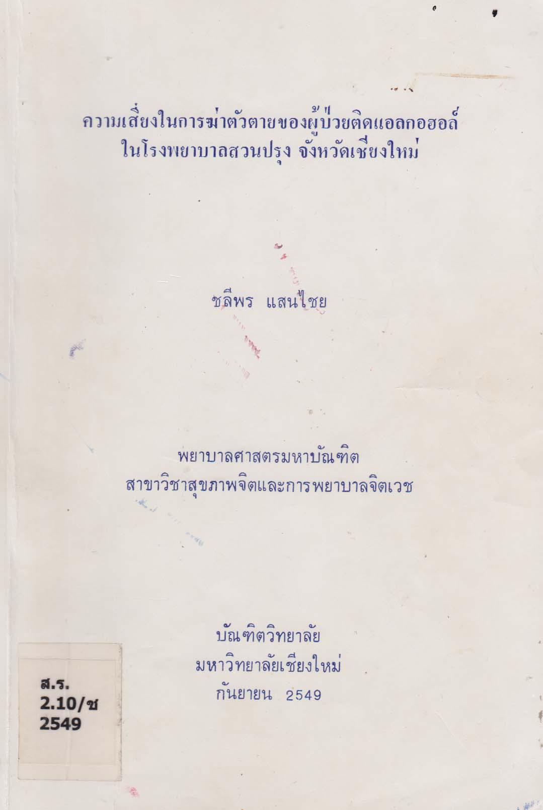 ความเสี่ยงในการฆ่าตัวตายของผู้ป่วยแอลกอฮอล์ในโรงพยาบาลสวนปรุง จังหวัดเชียงใหม่ /Suicide Risk of Alcoholic Patients at Suan Prung Psychiatric Hotpital, Chiang Mai Province /ชลีพร แสนไชย |