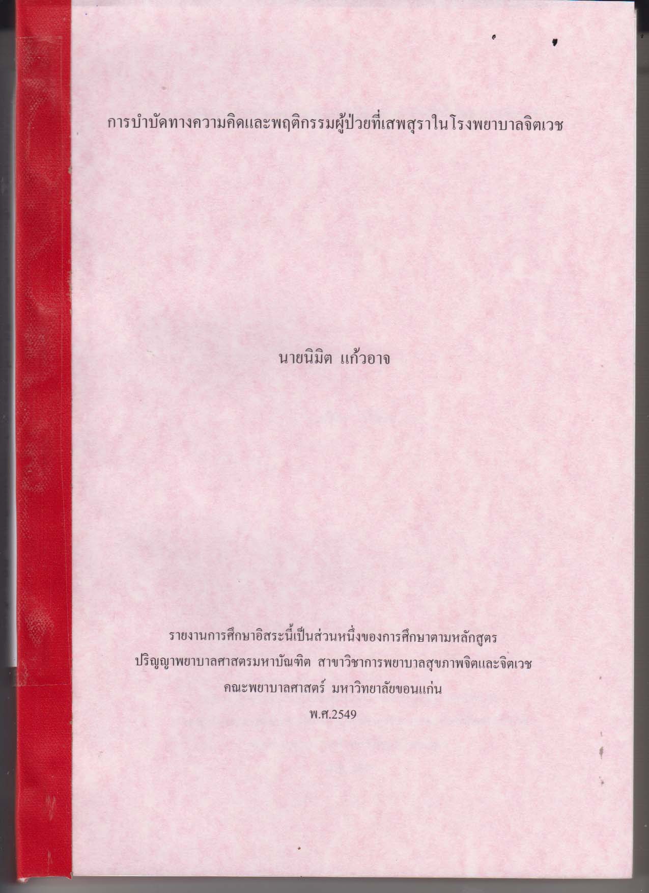 การบำบัดทางความคิดและพฤติกรรมผู้ป่วยที่เสพสุราในโรงพยาบาลจิตเวช Cognttive Behavioral Therapy for Alcohol used Patients in Psychiatric Hospital /นิมิต แก้วอาจ |