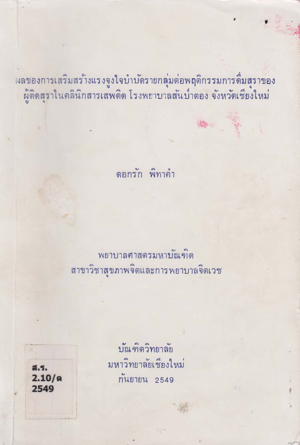 ผลของการเสริมสร้างแรงจูงใจบำบัดรายกลุ่มต่อพฤติกรรมการดื่มสุราของผู้ติดสุราในคลินิกสารเสพติด โรงพยาบาลสันป่าตอง จังหวัดเชียงใหม่ Effect of Motivational Enhancement Therapy Group on Drinking Behavior Among Persons with Alcohol Dependence at Addiction Clinic, Sanpatong Hospital,Chiang Mai Province/ดอกรัก พิทาคำ |