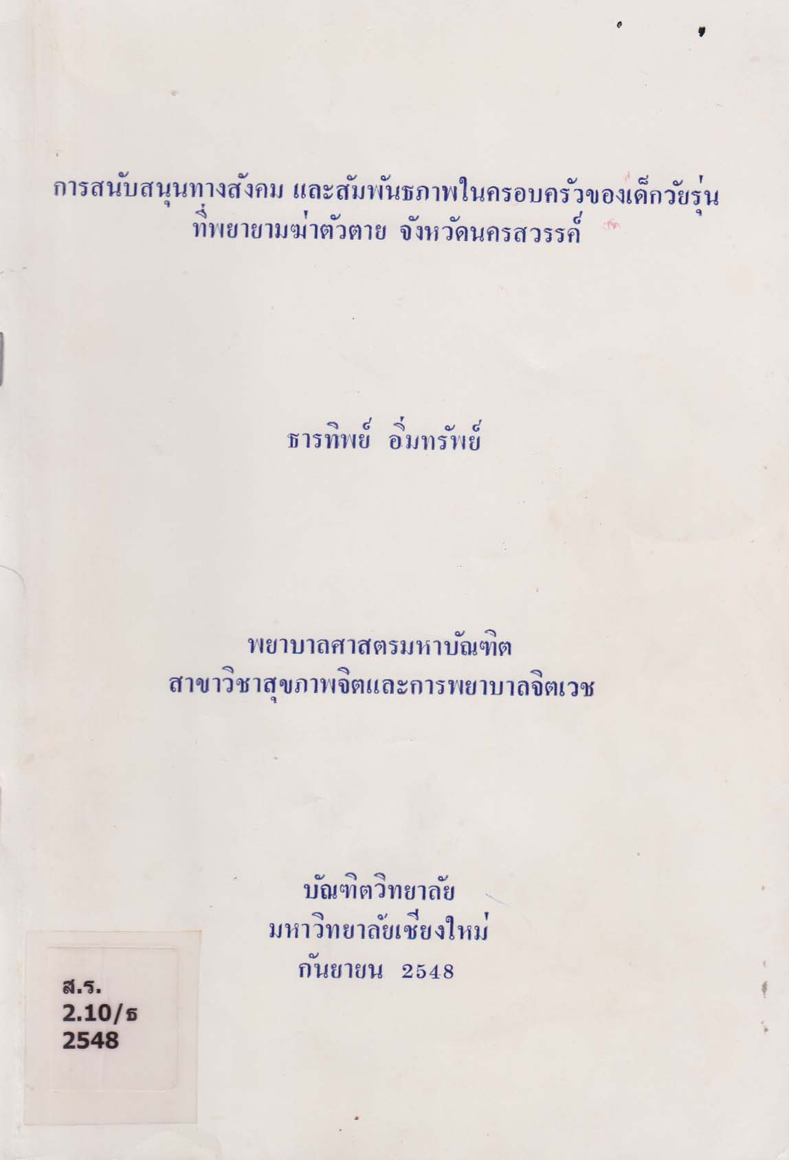 การสนับสนุนทางสังคม และสัมพันธภาพในครอบครัวของเด็กวัยรุ่นที่พยายามฆ่าตัวตาย จังหวัดนครสวรรค์ Social Support and Family Relations hips of Suicidal Attempted Adolescents in Nakhon Sawan Province/ธารทิพย์ อิ่มทรัพย์ |