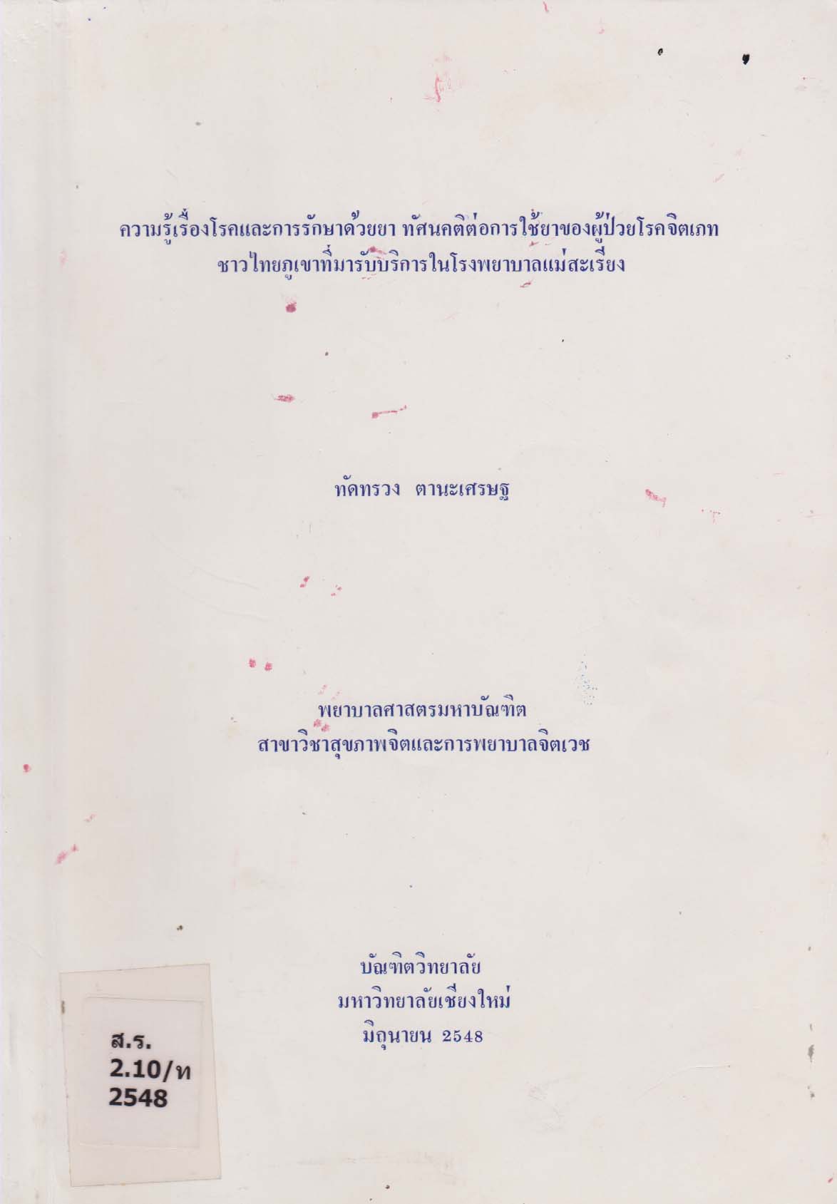 ความรู้เรื่องโรคและการรักษาด้วยยา ทัศนคติต่อการใช้ยาของผู้ป่วยโรคจิตเภท ชาวไทยภูเขาที่มารับบริการในโรงพยาบาลแม่สะเรียง Knowledge Regarding Disease and Trcatment,Attitude of Medication Among Hilltribe People with Schizophrenia Receiving Service at Maesarieng Hospital/ทัดทรวง ตานะเศรษฐ |
