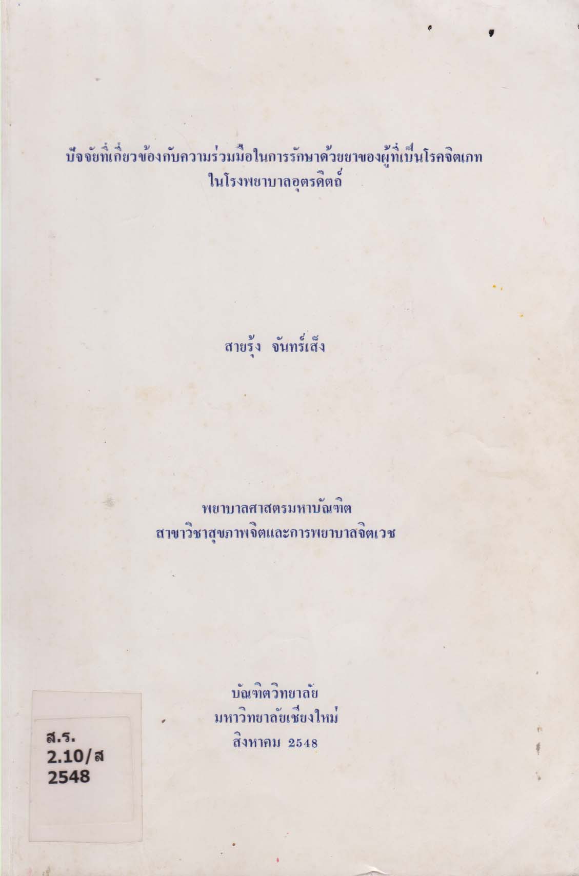 ปัจจัยที่เกี่ยวข้องกับความร่วมมือในการรักษาด้วยยาของผู้ที่เป็นโรคจิตเภทในโรงพยาบาลอุตรดิตถ์ Factors Relating to Medication Adherence in Schizophrenia at Uttaradit Hospital/สายรุ้ง จันทร์เส็ง |