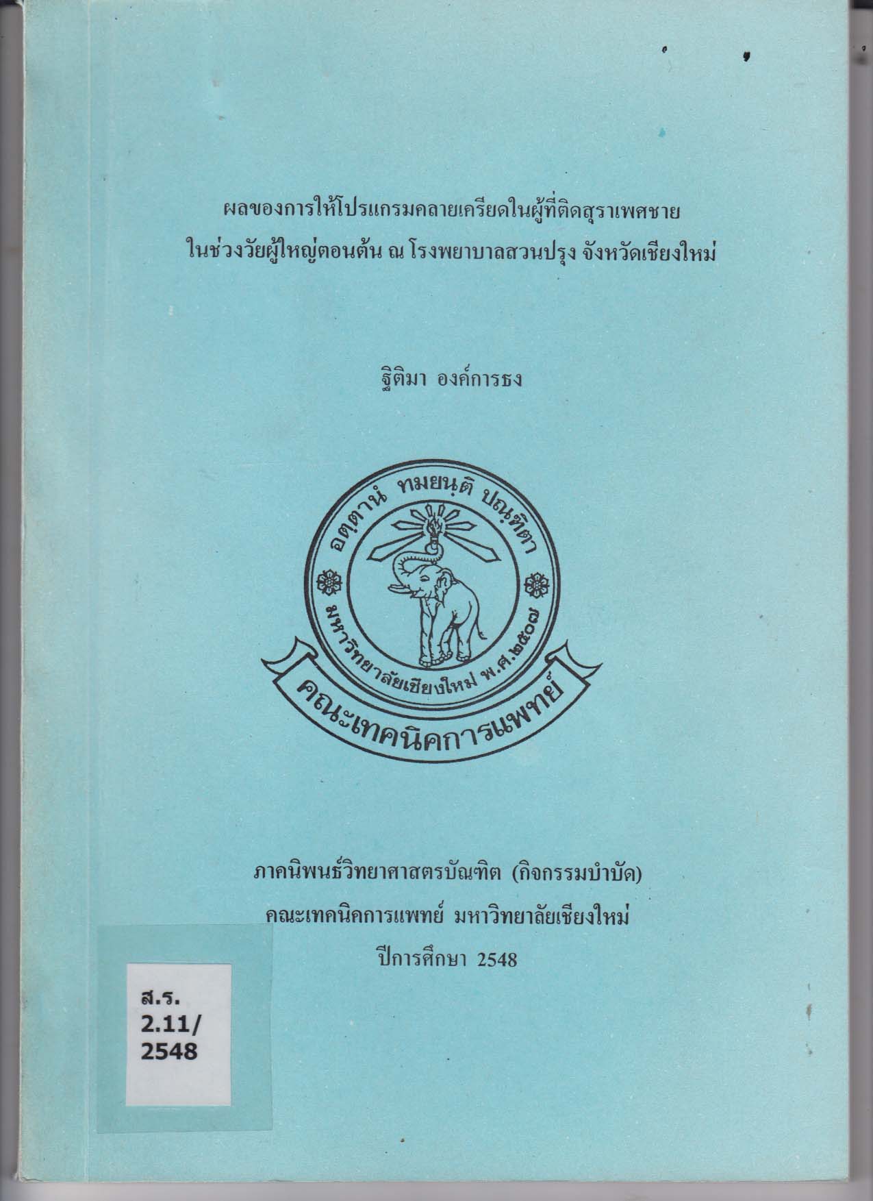 ผลของการให้โปรแกรมคลายเครียดในผู้ติดสุราเพศชายในช่วงวัยผู้ใหญ่ตอนต้น ณ โรงพยาบาลสวนปรุง จังหวัดเชียงใหม่ b/The effect the relaxation program in early adult alcoholic-male clients in SuanPrung Psychiatric Hospital, Chiang Mai Province/ฐิติมา องค์การธง |
