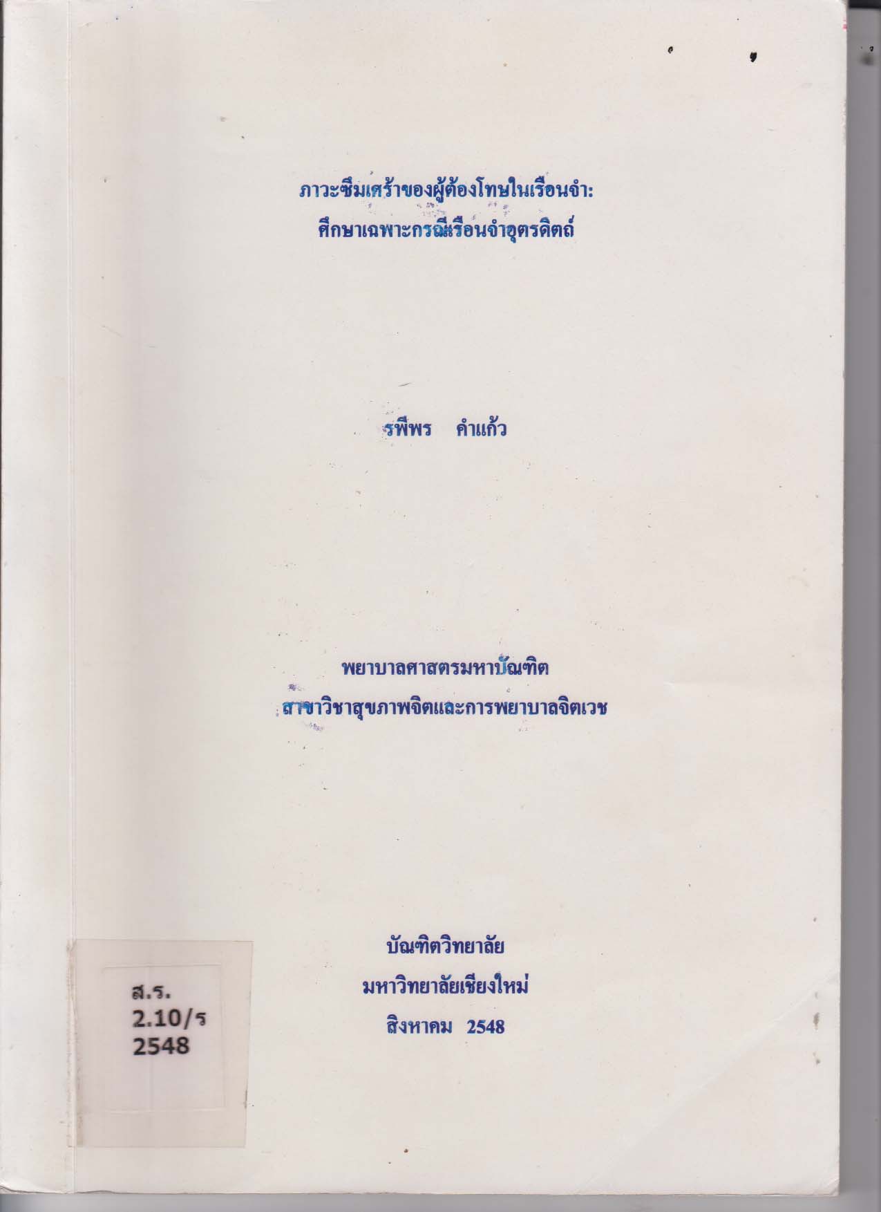 ภาวะซึมเศร้าของผู้ต้องโทษในเรือนจำ : ศึกษาเฉพาะกรณีเรือนจำอุตรดิตถ์ b/Depression of Incarcerated People in Prison:A Case Study of Uttaradit Prison/รพีพร คำแก้ว |