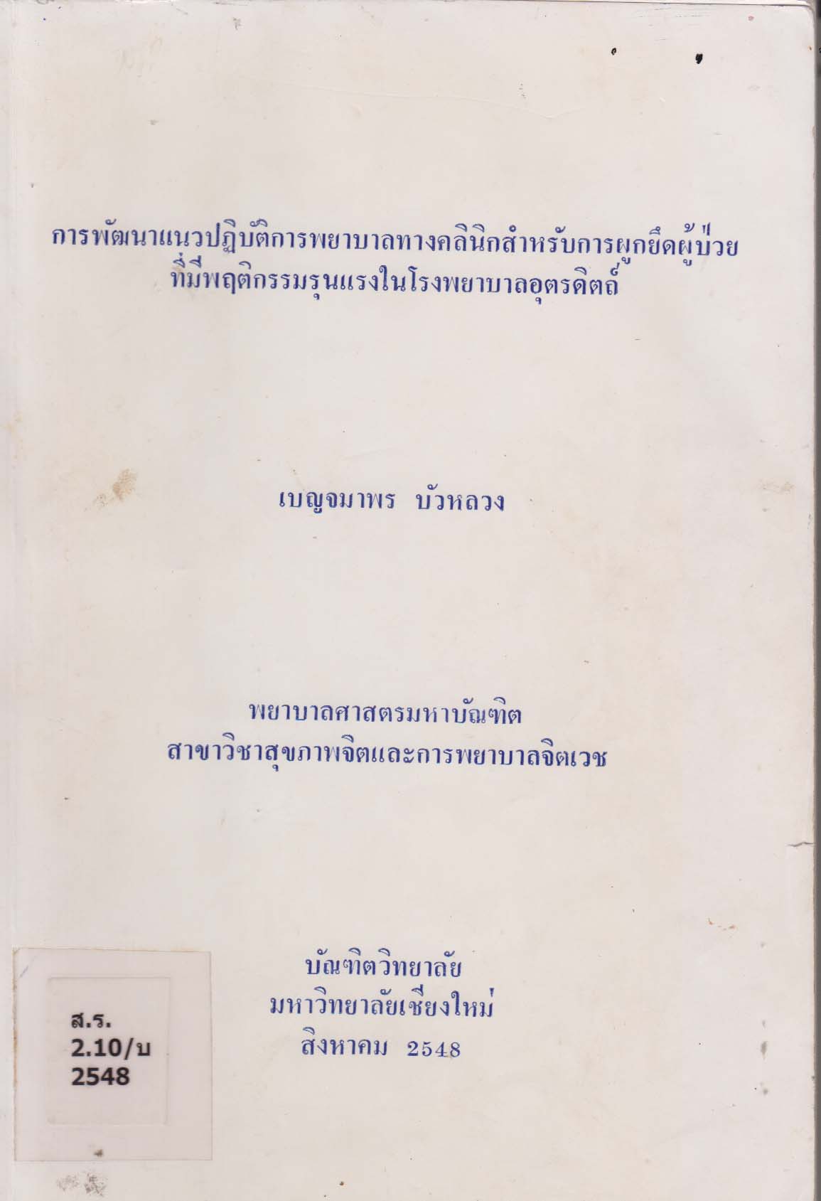 การพัฒนาแนวปฏิบัติการพยาบาลทางคลินิกสำหรับการผูกยึดผู้ป่วยที่มีพฤติกรรมรุนแรงในโรงพยาบาลอุตรดิตถ์ b/Development of Clinical Nursing Practice Guideline for Restraining Violent Patients at Uttaradit Hospital/เบญจมาพร บัวหลวง |
