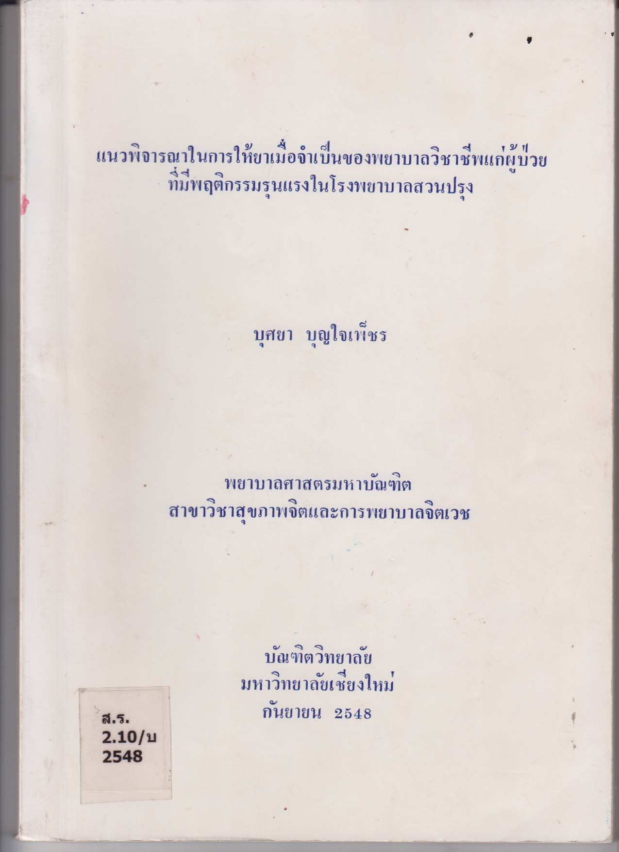 แนวพิจารณาในการให้ยาเมื่อจำเป็นของพยาบาลวิชาชีพแก่ผู้ป่วยที่มีพฤติกรรมรุนแรงในโรงพยาบาลสวนปรุง b/Practical Consideration Among Professional Nurses for PRN Medication to Patients with Violent Behaviors in Suan Prung Psychiatric Hospital/บุศยา บุญในเพ็ชร |