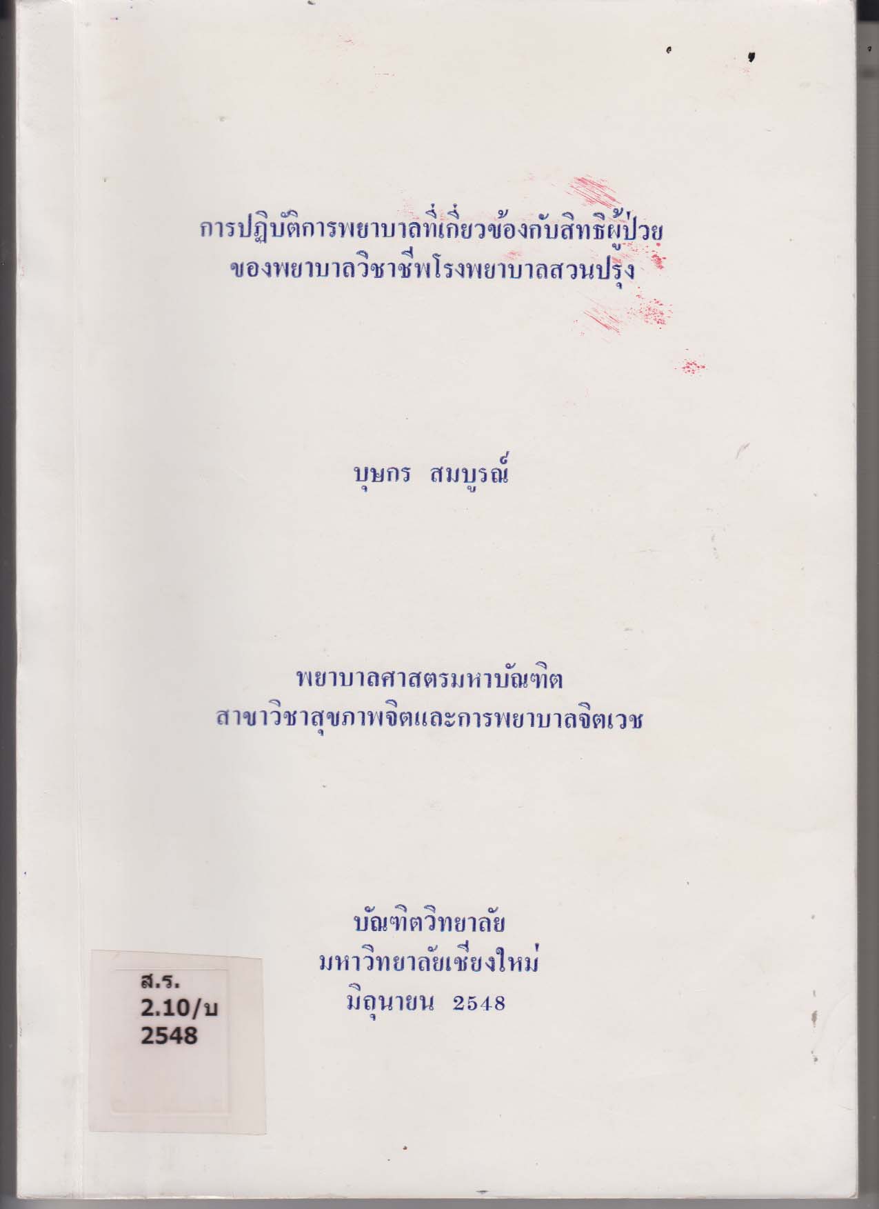 การปฏิบัติการพยาบาลที่เกี่ยวข้องกับสิทธิผู้ป่วยของพยาบาลวิชาชีพโรงพยาบาลสวนปรุง b/Nursing Activities Regarding Patient's Rights Among Professional Nurses in Suan Prung Psychiatric Hospital/บุษกร สมบูรณ์ |