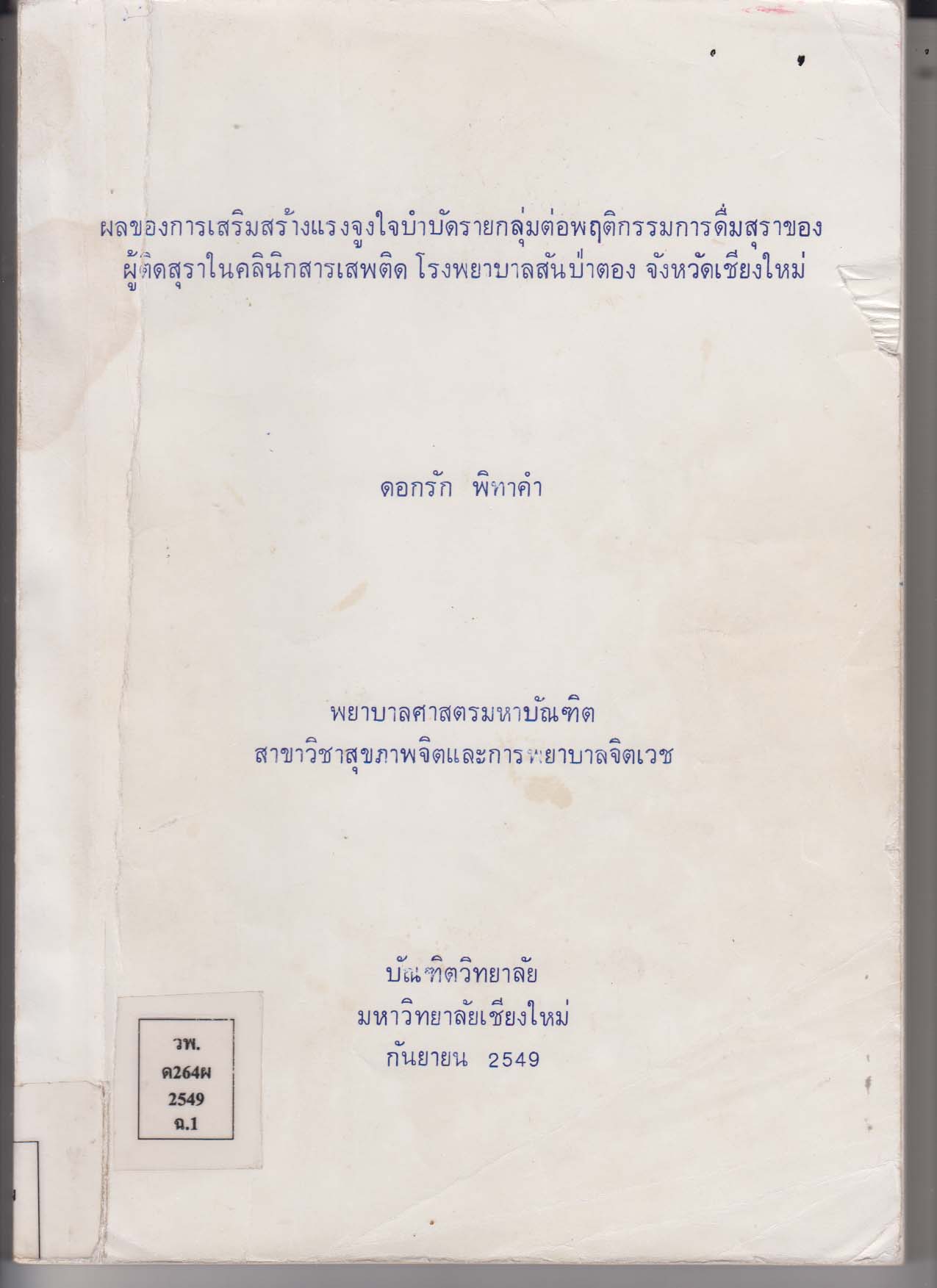 ผลของการเสริมสร้างแรงจูงใจบำบัดรายกลุ่มต่อพฤติกรรมการดื่มสุราของผู้ติดสุราในคลินิกสารเสพติด โรงพยาบาลสันป่าตอง จังหวัดเชียงใหม่ b/Effect of Motivational Enhancement Therapy Group on Drinking Behavior Among Persons with Alcohol Dependence at Addiction Clinic, Sanpatong Hospital, Chiang Mai Province/ดอกรัก พิทาคำ |