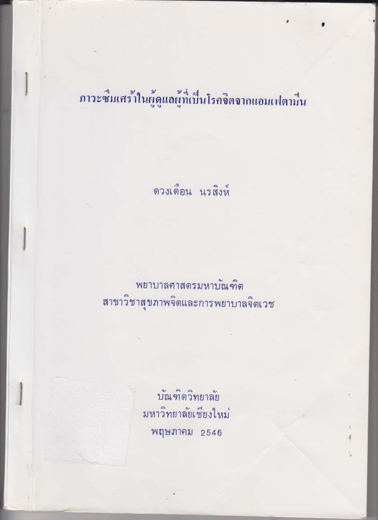 ภาวะซึมเศร้าในผู้ดูแลผู้ที่เป็นโรคจิตจากแอมเฟตามีนb/Depression Among Caregivers of Persons with Amphetamine Induced Psychotie Disorders/ดวงเดื่อน นรสิงห์ |