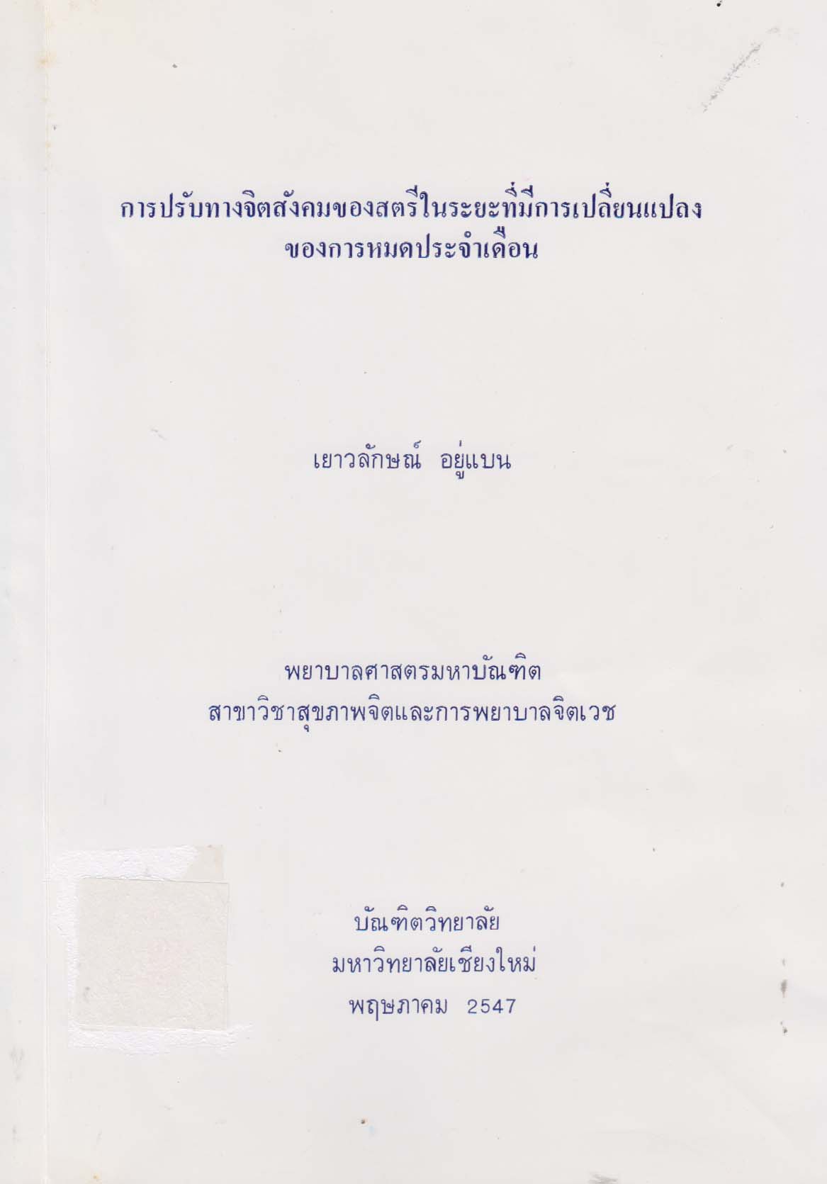 การปรับทางจิตสังคมของสตรีในระยะที่มีการเปลี่ยนแปลงของการหมดประจำเดือน/bPsychosocial Adjustment Among Perimenopausal Women/เยาวลักษณ์ อยู่แบน |