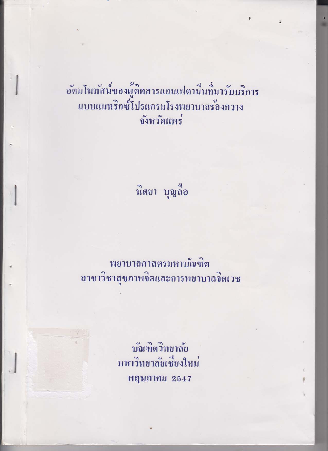 อัตมโนทัศน์ของผู้ติดสารแอมเฟตามีนที่มารับบริการแบบแมทริกซ์โปรแกรมโรงพยาบาลร้องกวาง จังหวัดแพร่/bSelf-concept of Persons with Amphetamine Dependence Receiving the Matrix Program at Rongkwang Hospital Phrae Province/นิตยา บุญลือ |