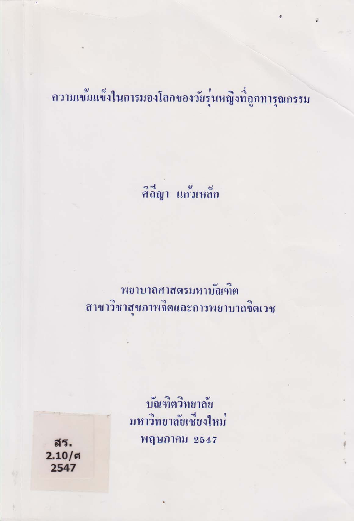ความเข้มแข็งในการมองโลกของวัยรุ่นหญิงที่ถูกทารุนกรรม/bSense of Coherence in Abused female Adolescents/ศิลีญา แก้วเหล็ก |