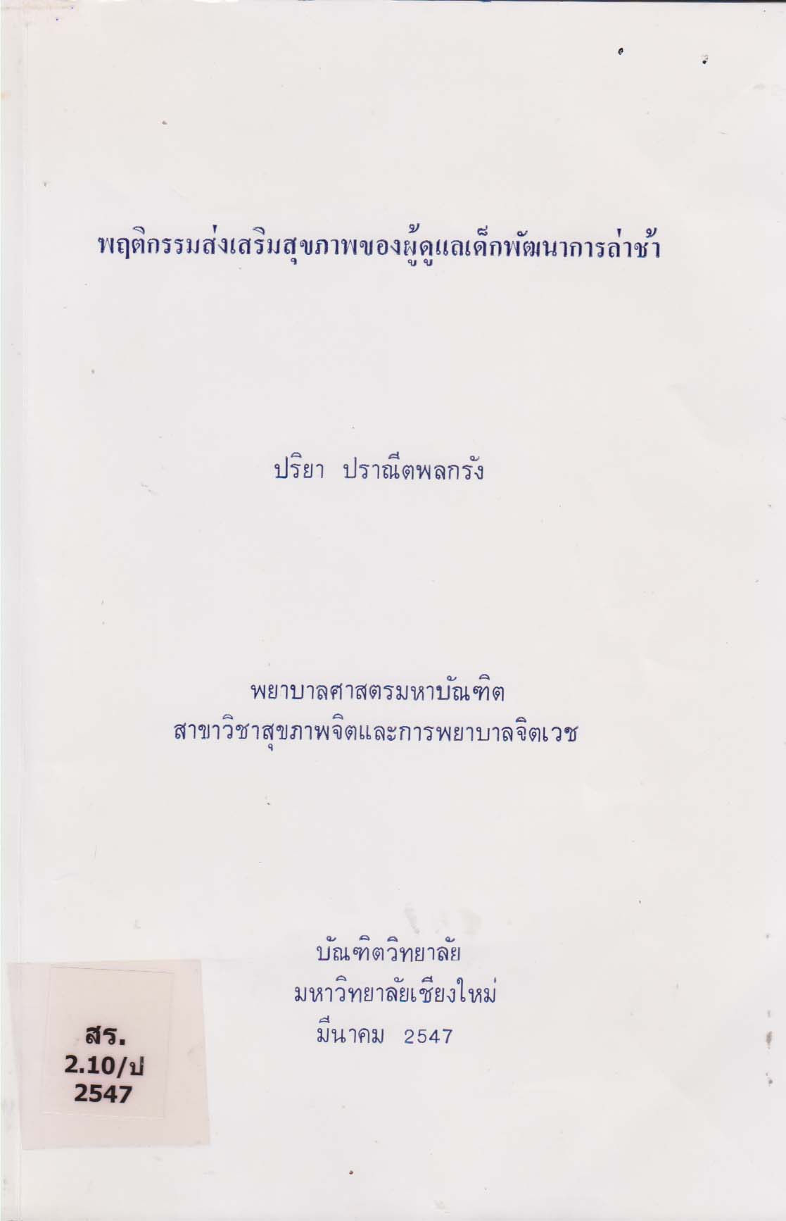 พฤติกรรมส่งเสริมสุขภาพของผู้ดูแลเด็กพัฒนาการล่าช้า/bHealth Promoting Behaviors Among Caregivers of Delayed Development Children /ปริยา ปราณีตพลกรัง |