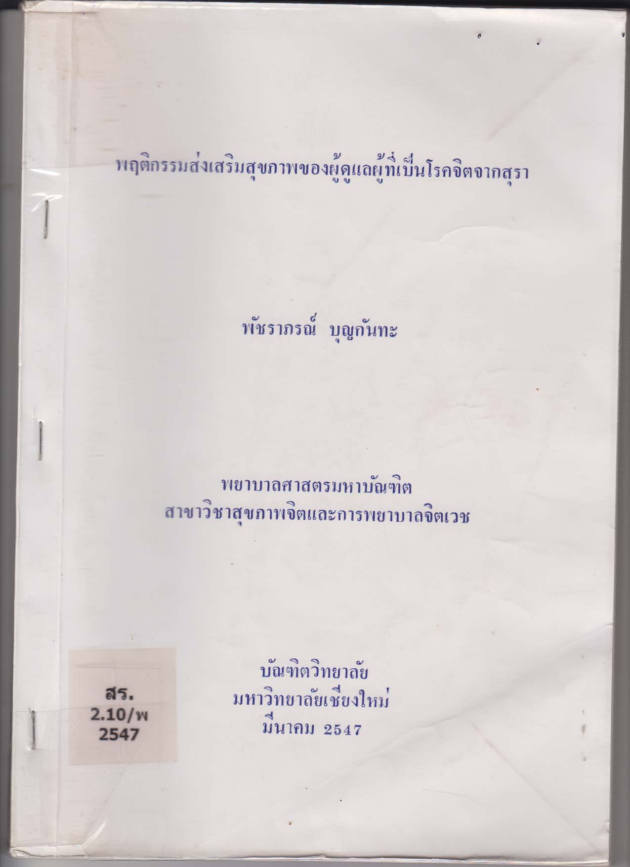 พฤติกรรมส่งเสริมสุขภาพของผู้ดูแลผู้ที่เป็นโรคจิตจากสุรา/bHealth Promoting Behaviors Among Caregivers of Persons with Alcohol Induced Psychotic Disorders/พัชราภรณ์ บุญกันทะ |