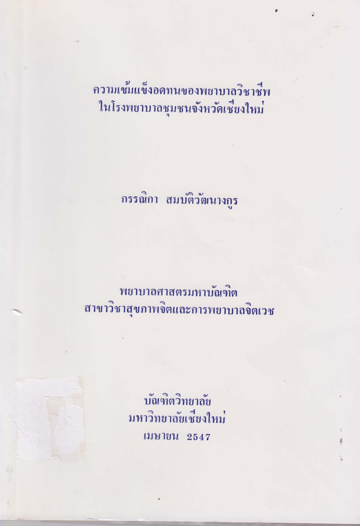 ความเข้มแข็งอดทนของพยาบาลวิชาชีพในโรงพยาบาลชุมชนจังหวัดเชียงใหม่/bHardiness Among Professional Nurses in Community Hospitals Chiang Mai Province /กรรณิกา สมบัติวัฒนางกูร |