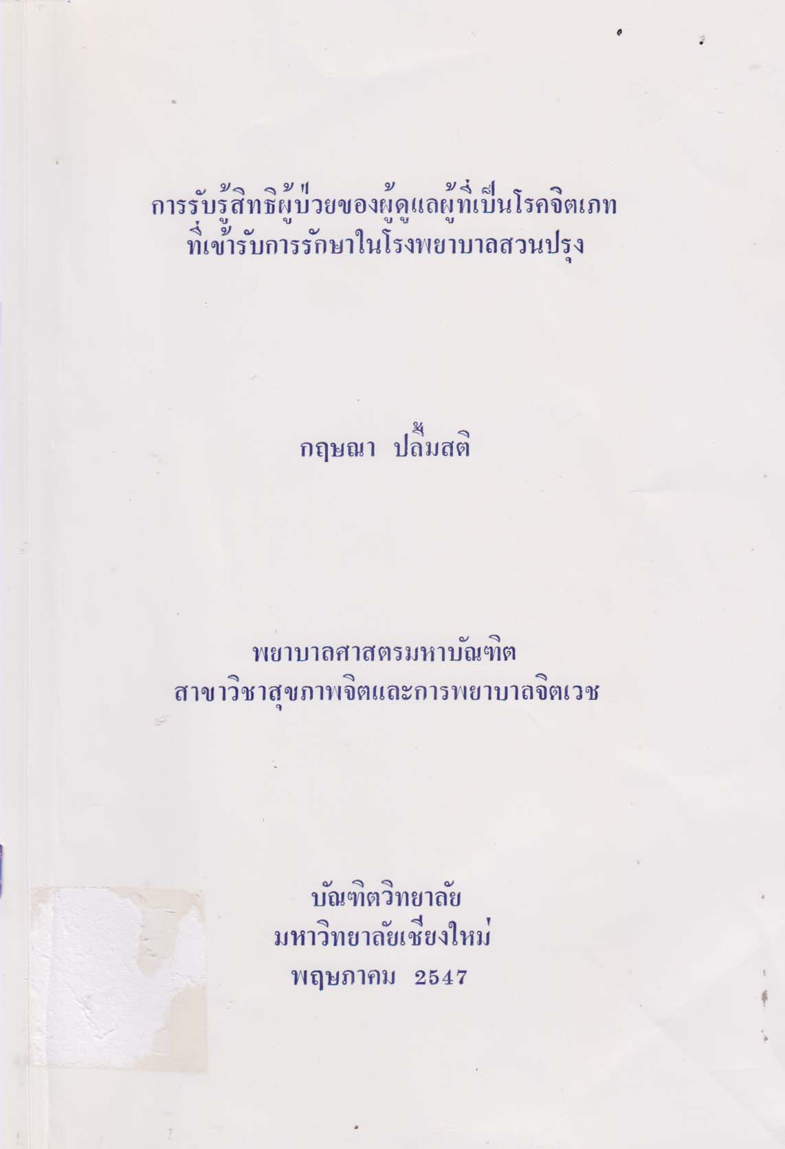 การรับรู้สิทธิผู้ป่วยของผู้ดูแลผู้ที่เป็นโรคจิตเภทที่เข้ารับการรักษาในโรงพยาบาลสวนปรุง/bPerception of Patient Rights Among Caregivers of Person with Schizophrenia Admitted to Suanprung Psychiatric Hospital /กฤษณา ปลื้มสติ |