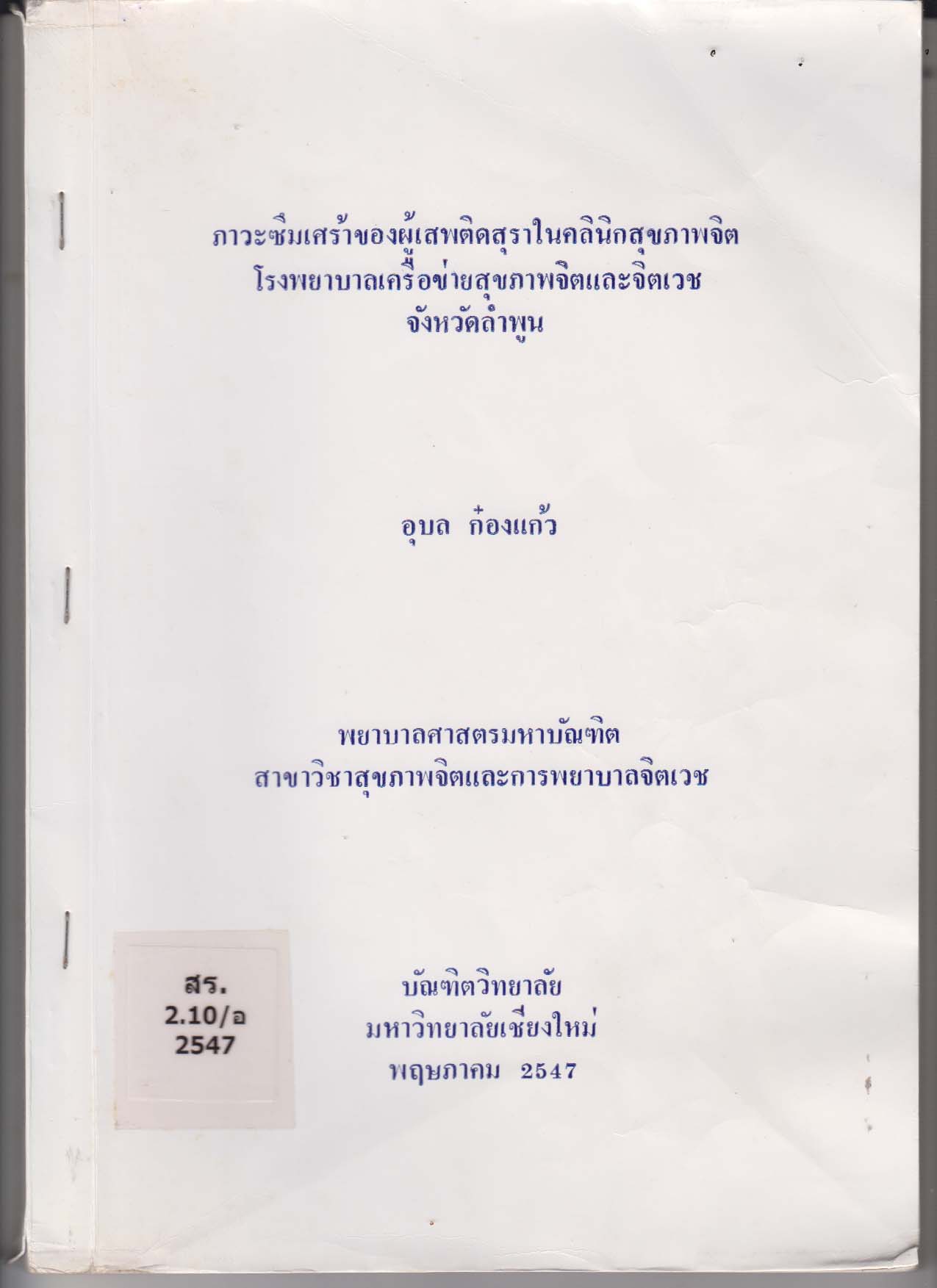 ภาวะซึมเศร้าของผู้เสพติดสุราในคลินิกสุขภาพจิต โรงพยาบาลเครือข่ายสุขภาพจิตและจิตเวช จังหวัดลำพูน/bDepression Among Persons with Alcohol Dependence at Mental Health Clinic, Mental Health and Psychiatric Network Hospital, Lamphun Province/อุบล ก๋องแก้ว |