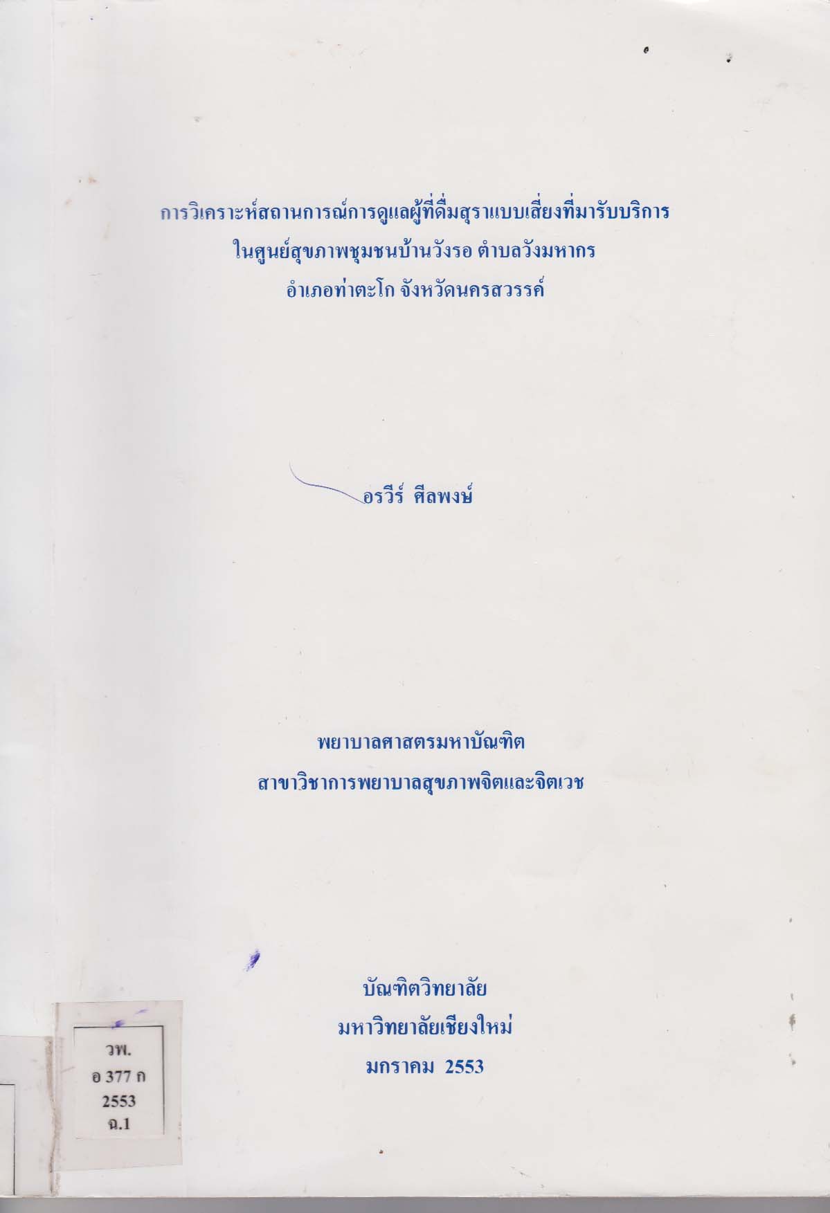 การวิเคราะห์สถานการณ์การดูแลผู้ที่ดื่มสุราแบบเสี่ยงที่มารับบริการในศูนย์สุขภาพชุมชนบ้านวังรอ ตำบลวังมหากร อำเภอท่าตะดก จังหวัดนครสวรรค์/bSituational Analysis of Caring for Persons with Risky Drinking Behaviors Receiving Services at Wangrou Primary Care Unit, Wang Mahakon Subdistrict,Tha Tako District, Nakhon Sawan Province/อรวีร์ ศีลพงษ์