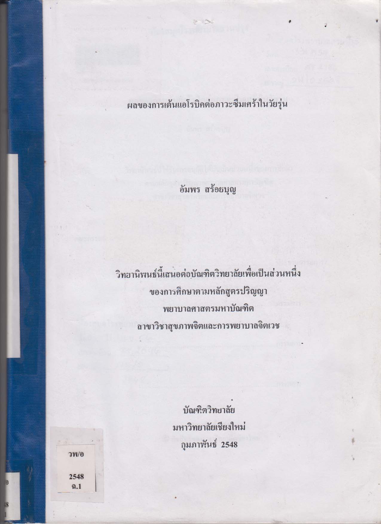 ผลของการเต้นแอโรบิคต่อภาวะซึมเศร้าในวัยรุ่น/bEffect of Aerobic Dance on Depression Among Adolescenis/อัมพร สร้อยบุญ |